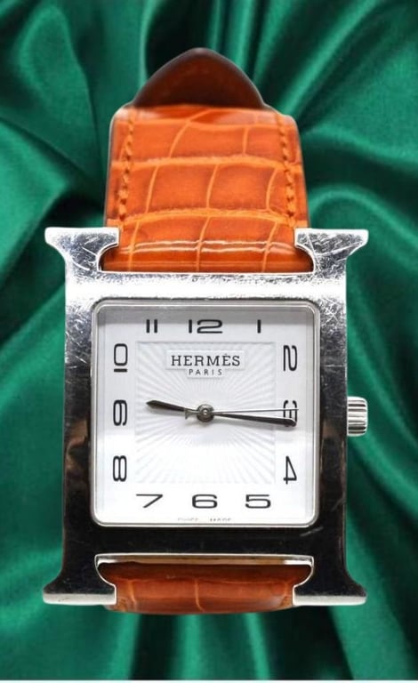 HERMES HEURE H WATCH 34 MM Price Guide - $1,000 - $2,500 Length: 23cm Height: 25mm Material Steel case and leather strap Movement - Quartz movement, Swiss Made. Water Resistant - Water-resistant to 3 bar. Additional Condition Report - Moderate sign of wear throughout - Moderate scratches on hardware Comes With - Original Box - Proof of Purchase Price Guide - $1,000 - $2,500 CROSSED DOCKED 155392+47