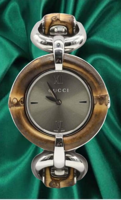 GUCCI CHAMPAGNE STAINLESS STEEL BAMBOO 132.4 Case Diameter: 35mm Bracelet Size: 17cm Material Stainless steel with quartz movement and bamboo bracelet with hinged clasp. Additional Condition Report - Moderate sign of wear and scratches throughout Comes With - Original Box - Care Book - Spare Links - Certificate of Authenticity CROSSED DOCKED 55392+31