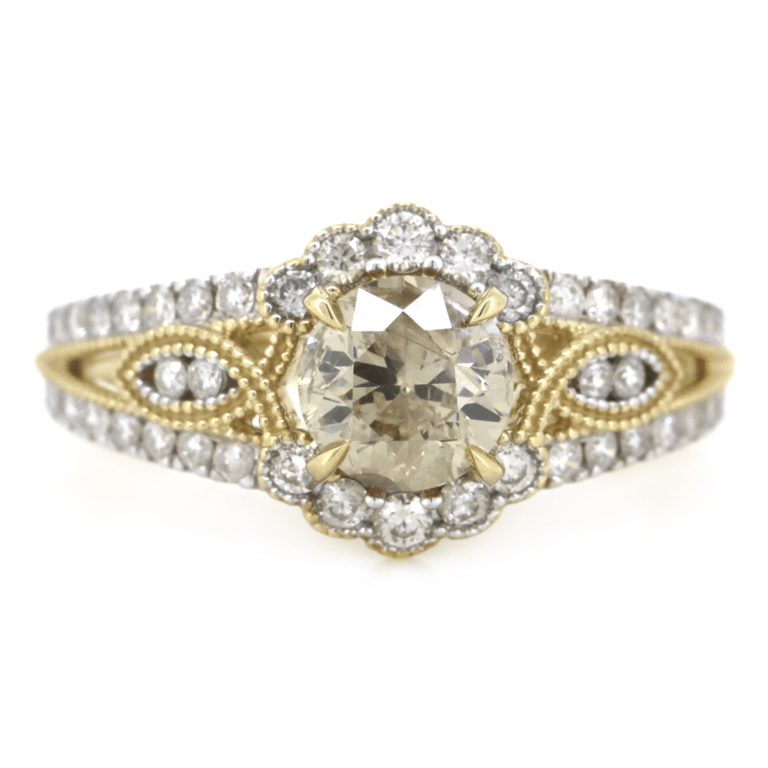 14K YELLOW GOLD, CHAMPAGNE DIAMOND AND DIAMOND, HALO FILIGREE RING. The Centre Features, One Heart Modified Brilliant Cut, Light Fancy Yellow, Diamond (2.11Ct Tdw, Si1-Si2 Clarity), 4 Claw Set. Surrounding The Centre In A Halo And Decorating The Band Are, 36 Round Brilliant Cut, Diamonds (0.26Ct Tdw, I-K Colour, P2+ Clarity), Claw Set. Ring Size M 1/2. Valuations Provided by an Independent Third-Party Professional Not Directly Associated With Lloyds Auctions at AUD $$22,820.00This valuation has been conducted by an independent third-party professional. The valuation amount is an assessment by the issuing valuer and does not reflect the auction value of the item. Any inquiries regarding the valuation should be directed to the issuing valuer (refer to contact details on the certificate), as Lloyds Auctions has no affiliation or influence over the valuation, the valuer, or the stated amount. Condition: Good - Refer Images 0645836+3020
