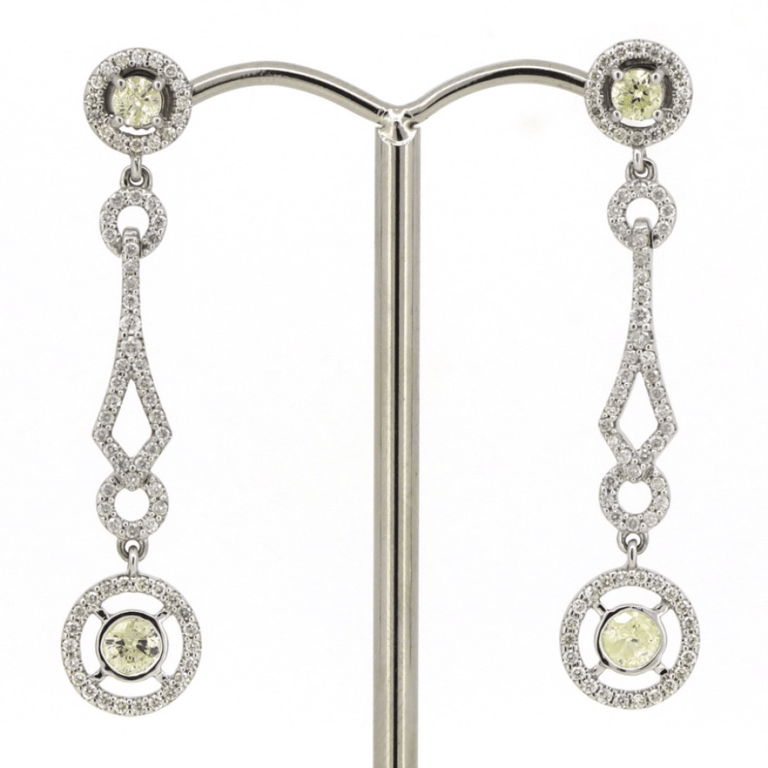 14K WHITE GOLD, YELLOW DIAMOND, ART DECO INSPIRED DROP EARRINGS.