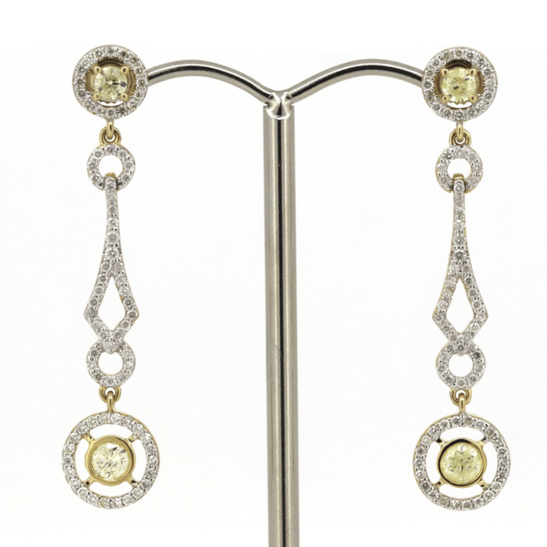 14K YELLOW GOLD, YELLOW DIAMOND, ART DECO INSPIRED DROP EARRINGS. The Centre Features, One Radiant Cut, Diamond (0.71Ct, I-J Colour, P1-P2 Clarity), 4 Claw Set. Decorating The Centre And The Band Are, 42 Round Brilliant Cut, Diamonds (0.56Ct Tdw, H-J Colour, Si2-P2 Clarity), Claw Set. Ring Size L 1/2. Valuations Provided by an Independent Third-Party Professional Not Directly Associated With Lloyds Auctions at AUD $$13,400.00This valuation has been conducted by an independent third-party professional. The valuation amount is an assessment by the issuing valuer and does not reflect the auction value of the item. Any inquiries regarding the valuation should be directed to the issuing valuer (refer to contact details on the certificate), as Lloyds Auctions has no affiliation or influence over the valuation, the valuer, or the stated amount. Condition: Good - Refer Images 0645836+3077