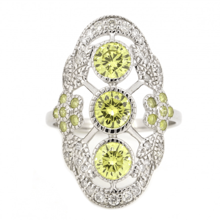 14K WHITE GOLD, FANCY YELLOW DIAMOND AND DIAMOND, ART DECO INSPIRED RING. The Centre Features, One Oval Faceted Cut, Diamond (1.12Ct, C2 Colour, Vs1-Vs2 Clarity), Bezel Set. Encompassing The Centre Are, 106 Round Brilliant Cut, Diamonds (0.78Ct Tdw, G-H Colour, Si1-Si2 Clarity), Bead/Claw Set. Ring Size N1/2. Valuations Provided by an Independent Third-Party Professional Not Directly Associated With Lloyds Auctions at AUD $$37,000.00This valuation has been conducted by an independent third-party professional. The valuation amount is an assessment by the issuing valuer and does not reflect the auction value of the item. Any inquiries regarding the valuation should be directed to the issuing valuer (refer to contact details on the certificate), as Lloyds Auctions has no affiliation or influence over the valuation, the valuer, or the stated amount. Condition: Good - Refer Images 0645836+3029