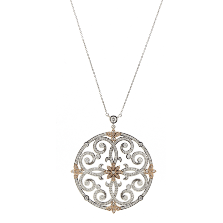 14K WHITE/ROSE GOLD, PINK DIAMOND AND DIAMOND, ART DECO INSPIRED NECKLACE.