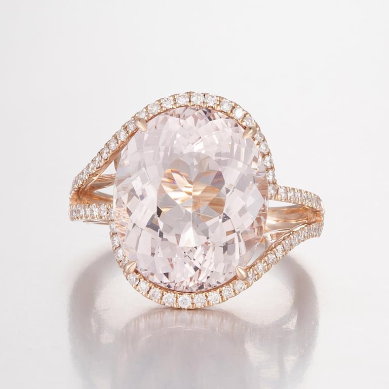 Featuring Centre, One Oval Cut, Pale Blossom/ Faint Pink Morganite (9.27Ct, Slightly Included), Claw Set, With 70 Round Brilliant Cut Diamonds (0.35Ct Tdw, F-G Colour, Vs2-Si1 Clarity), Pip Claw Set. Ring Size O.