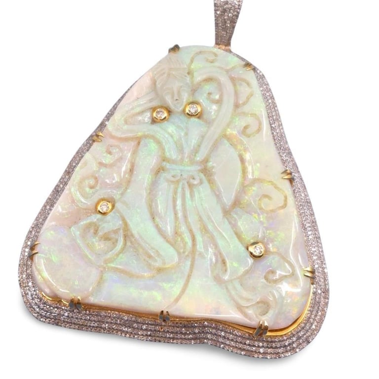 HANDCRAFTED 9CT YELLOW GOLD OPAL AND DIAMOND PENDANT. Measures 83.4Mm X 65.4Mm And Is Set With A 59.4Mm X 55.9Mm 193.00Ct Triangular Light Opal Which Has Been Hand Carved. The Opal Is Surrounded By Seven Hundred And Eighty (Approx.) Brilliant Cut Diamonds Colour "I" And Clarity "13" With A Total Diamond Weight Of 2.16Ct. The Pendant Is Stamped 9K And Weighs 60.9Gms. Total Item Weight: 60.90g Markings: 9K Condition: Good - Refer To Images This valuation has been conducted by an independent third-party professional. The valuation amount is an assessment by the issuing valuer and does not reflect the auction value of the item. Any inquiries regarding the valuation should be directed to the issuing valuer (refer to contact details on the certificate), as Lloyds Auctions has no affiliation or influence over the valuation, the valuer, or the stated amount. Insurance Replacement Valuation Amount: $35,625.00 586120+1