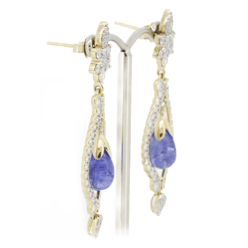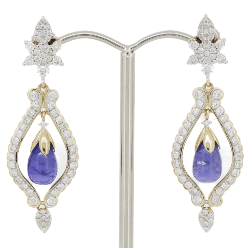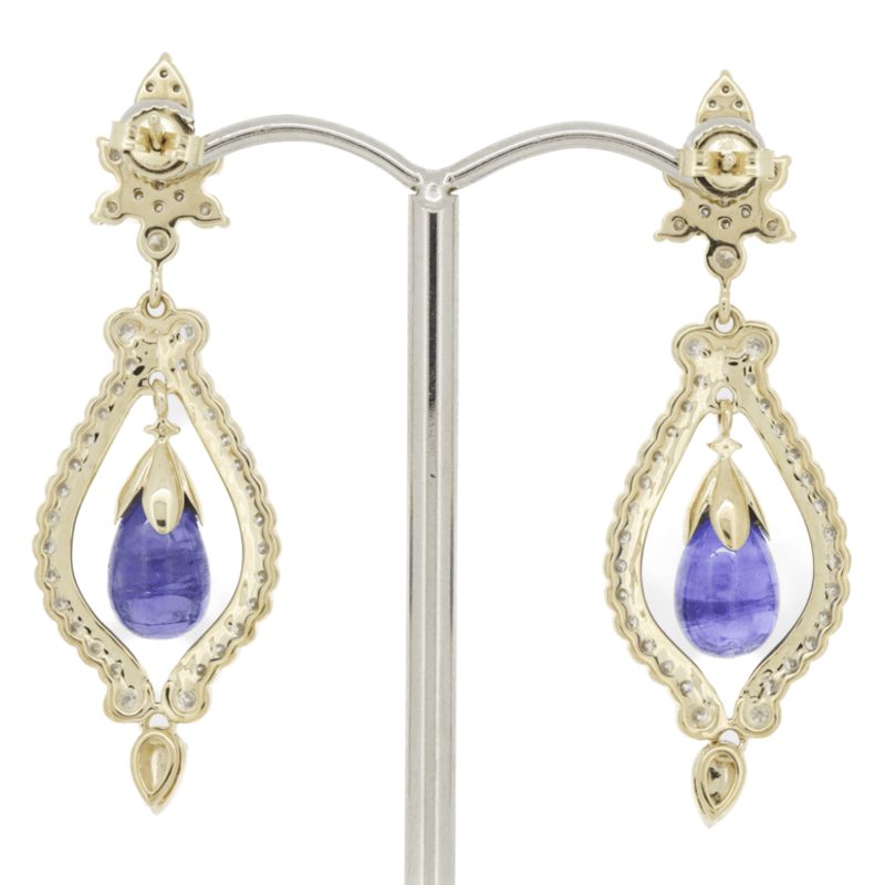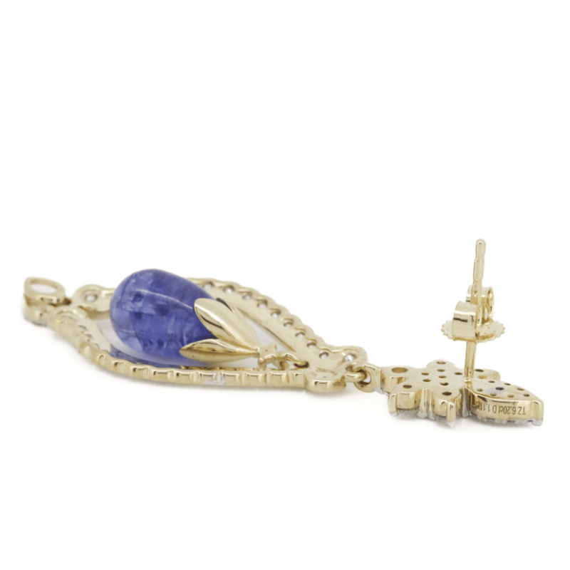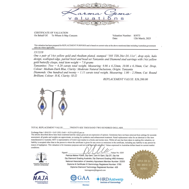 14K YELLOW GOLD, TANZANITE AND DIAMOND, DECORATIVE DROP EARRINGS. The Centers Feature, 2 Drop Cut, Medium-Dark Blue, Tanzanites (6.20Ct Tsw, Moderate Natural Inclusions), Partial Bezel Set. Embellishing The Drop Design Are, 120 Round Brilliant Cut, Diamonds (1.11Ct Tdw, H-K Colour, Si-I2 Clarity), Partial Bezel/Bead Set. The Earrings Have Post Backs, With 14K Yellow Gold Butterfly Clasps. Valuations Provided by an Independent Third-Party Professional Not Directly Associated With Lloyds Auctions at AUD $$26,200.00This valuation has been conducted by an independent third-party professional. The valuation amount is an assessment by the issuing valuer and does not reflect the auction value of the item. Any inquiries regarding the valuation should be directed to the issuing valuer (refer to contact details on the certificate), as Lloyds Auctions has no affiliation or influence over the valuation, the valuer, or the stated amount. Condition: Good - Refer Images 0645844+5048