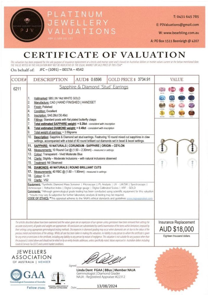 14CT WHITE GOLD CEYLON SAPPHIRE AND DIAMOND STUD EARRINGS FEATURING CENTRE, 10 ROUND CUT, VIVID MODERATE BLUE CEYLON SAPPHIRES (0.28CT TSW, SLIGHTLY-MODERATELY INCLUDED), CLAW SET, WITH 40 ROUND BRILLIANT CUT DIAMONDS (0.49CT TDW, G-H COLOUR, VS2 CLARITY), BEAD SET. Valuations Provided by an Independent Third-Party Professional Not Directly Associated With Lloyds Auctions at AUD $18000This valuation has been conducted by an independent third-party professional. The valuation amount is an assessment by the issuing valuer and does not reflect the auction value of the item. Any inquiries regarding the valuation should be directed to the issuing valuer (refer to contact details on the certificate), as Lloyds Auctions has no affiliation or influence over the valuation, the valuer, or the stated amount. Condition: Good - Refer Images 0+459