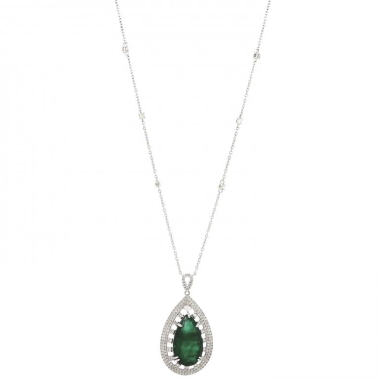 14K White Gold, 15.67Ct Emerald And Diamond, Statement Necklace. The Pendant Features, One Pear Cut, Medium Dark Bluish-Green, Emerald (15.67Ct, Included), Multi-Claw Set. Surrounding The Centre In A Floating Halo, Encompassed By Another Halo And Decorating The Chain Are, 168 Round Brilliant Cut, Diamonds (1.60Ct Tdw, H-J Colour, Si2-I2 Clarity), Claw/Micro-Claw Set. The Necklace Has A Lobster Claw Clasp. Chain Length Is 46.5Cm.