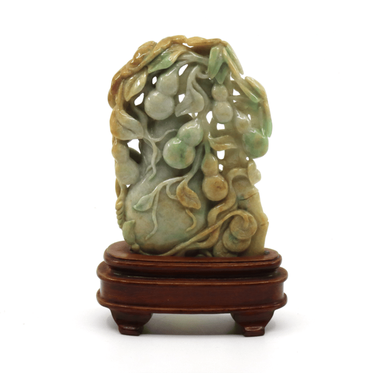 Natural Burmese Jade, Intricate Carving Of Gourd Vine With Foliage. The Jade Displays Soft Green To Honey-Brown Colours, With Opaque Clarity. Burmese Origin. The Total Item Weight Is 322Grams.