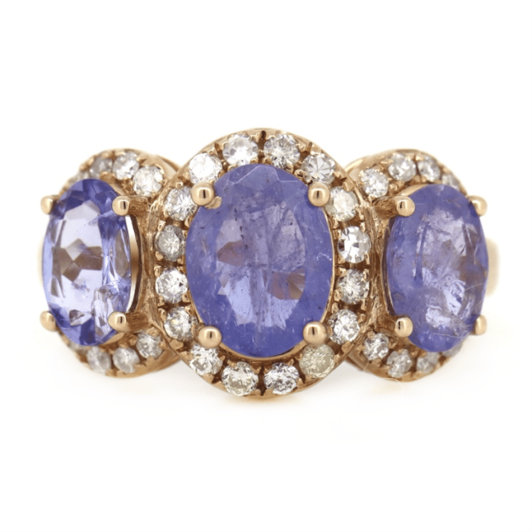 14K Rose Gold, Tanzanite And Diamond, Halo Trilogy Ring. The Centre Features, 3 Oval Cut, Purplish-Blue, Tanzanites (2.54Ct Tsw, Eye Visible Inclusions), Claw Set. Surrounding The Centre In Halos Are, 40 Round Brilliant Cut, Diamonds (0.48Ct Tdw, H-J Colour, Si2-I2 Clarity), Claw Set. Ring Size M ½.