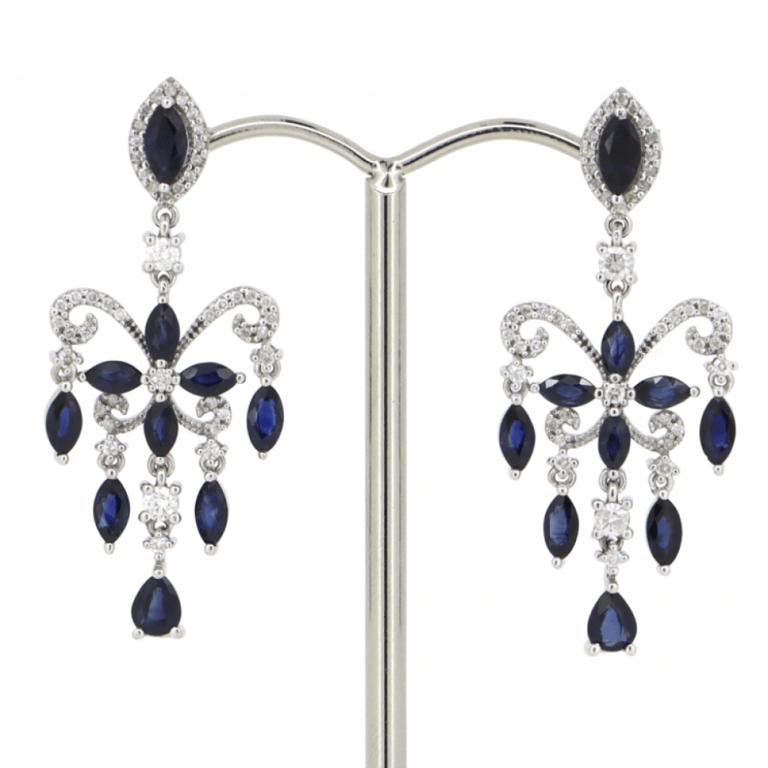 14K White Gold, Blue Sapphire And Diamond, Chandelier Inspired Drop Earrings. The Designs Feature, 2 Pear Cut And 18 Marquise Cut, Royal Blue, Sapphires (3.43Ct Tsw, Minor Eye Visible Inclusions), Claw Set. Decorating The Designs Are, 76 Round Brilliant Cut, Diamonds (0.66Ct Tdw, J-K Colour, Si2-I2 Clarity), Bead Set. The Earrings Have Post Backs, With 14K White Gold Butterfly Clasps.