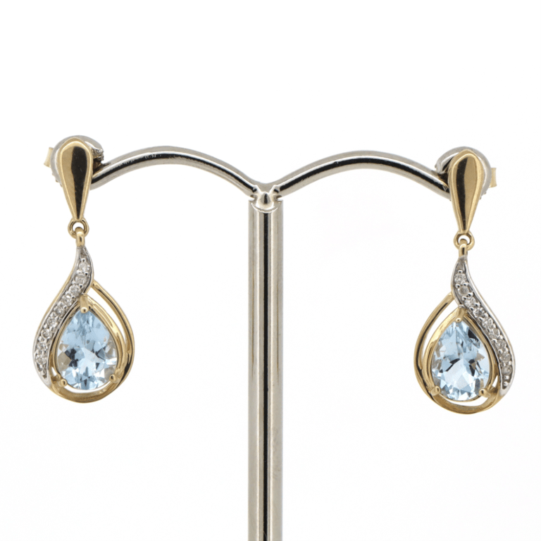 The Centres Feature, 2 Pear Cut, Greyish-Blue, Aquamarines (1.32Ct Tsw, Minor Eye Visible Inclusions), 3 Claw Set. Surrounding The Centres Are, 18 Round Brilliant Cut, Diamonds (0.07Ct Tdw, J-K Colour, Si2-I2 Clarity), Bead Set. The Earrings Have Post Backs, With 14K Yellow Gold Butterfly Clasps.