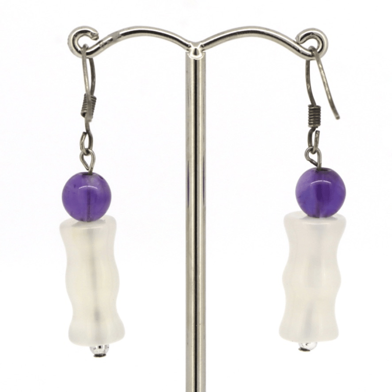 Created Stone Drop Earrings. The Earrings Feature, 2 Purple Coloured Spheric Beads & 2 Cloudy White Wavy Cylinder Beads. Condition: Pre-Owned.