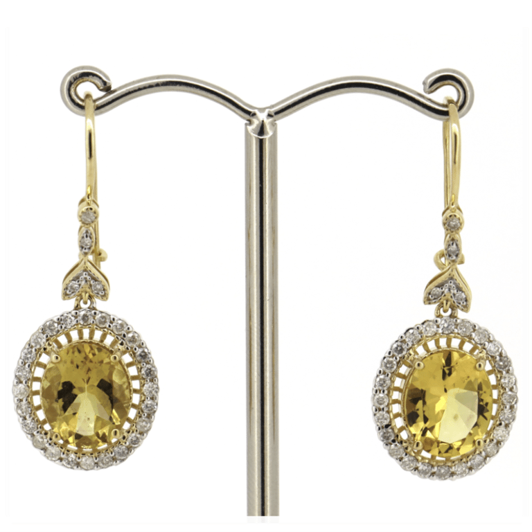 14K Yellow Gold, Heliodor And Diamond, Antique Inspired Drop Earrings. The Centre Features, 2 Oval Cut, Medium Greyish-Yellow, Heliodors (3.94Ct Tsw, Minor Eye Visible Inclusions), Claw Set. Surrounding The Centres In Halos And Decorating The Joins/Hooks Are, 56 Round Brilliant Cut, Diamonds (0.61Ct Tdw, J-K Colour, Si2-I2 Clarity), Bead Set In White Gold With Millegrain Detail. The Earrings Feature Shepherd Hooks With 'C' Hook Closures.