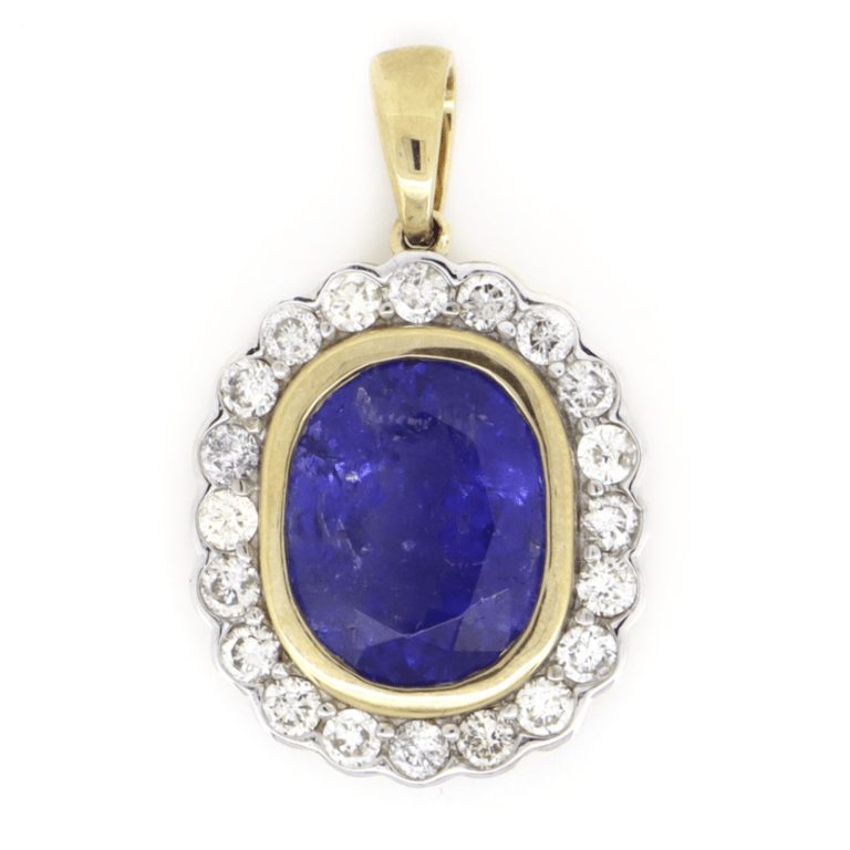 14K Yellow Gold, Tanzanite And Diamond, Halo Pendant. The Centre Features, One Oval Faceted Cut, Deep Violetish-Blue, Tanzanite (4.48Ct, Included), Bezel Set. Surrounding The Centre In A Halo Are, 20 Round Brilliant Cut, Light-Medium Champagne, Diamonds (0.71Ct Tdw, Si2-P2 Clarity), Bead Set.