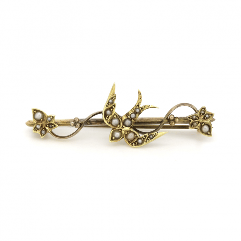 Vintage 15K Yellow Gold, Pearl Swallow Brooch. Total Item Weight Is 3.89 Grams. Condition: Pre-Owned.