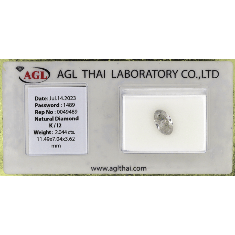2.044CT CERTIFIED, NATURAL DIAMOND, OVAL BRILLIANT CUT, K COLOUR, I2 CLARITY, LOOSE, UNSET. Oval Brilliant Cut, K Colour, I2 Clarity, Loose, Unset. Stone Comes Sealed With Agl Report: 0049489. Valuations Provided by an Independent Third-Party Professional Not Directly Associated With Lloyds Auctions at AUD $$20,500.00This valuation has been conducted by an independent third-party professional. The valuation amount is an assessment by the issuing valuer and does not reflect the auction value of the item. Any inquiries regarding the valuation should be directed to the issuing valuer (refer to contact details on the certificate), as Lloyds Auctions has no affiliation or influence over the valuation, the valuer, or the stated amount. Condition: Good - Refer Images 0645843+7035
