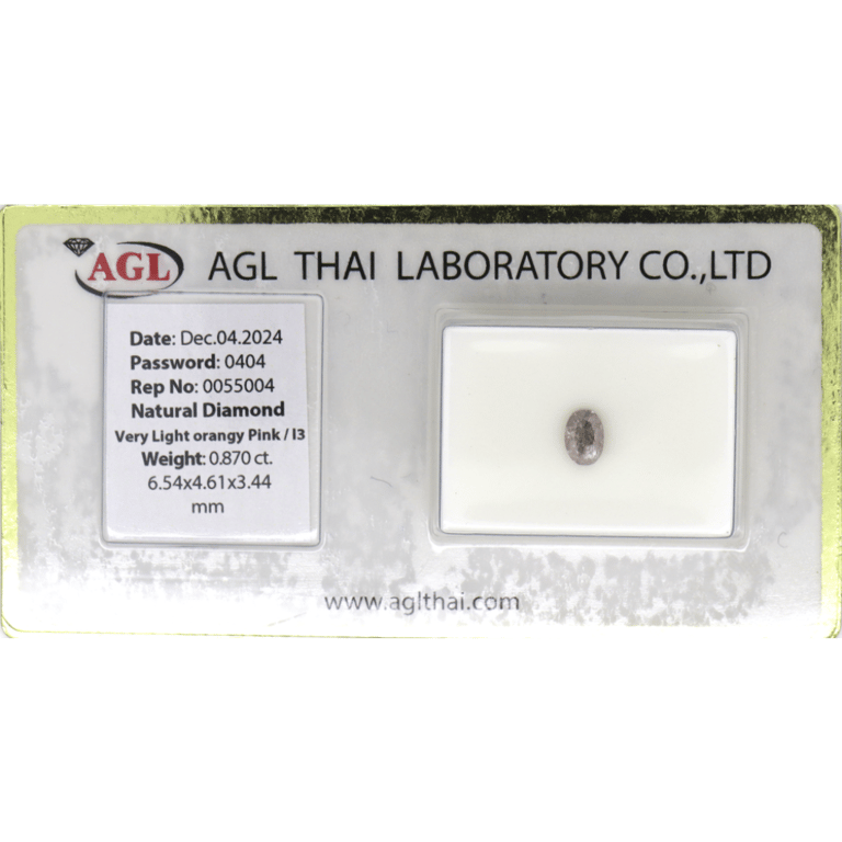 0.870CT CERTIFIED, NATURAL PINK DIAMOND, OVAL BRILLIANT CUT, VERY LIGHT ORANGY PINK, I3 CLARITY, LOOSE, UNSET.