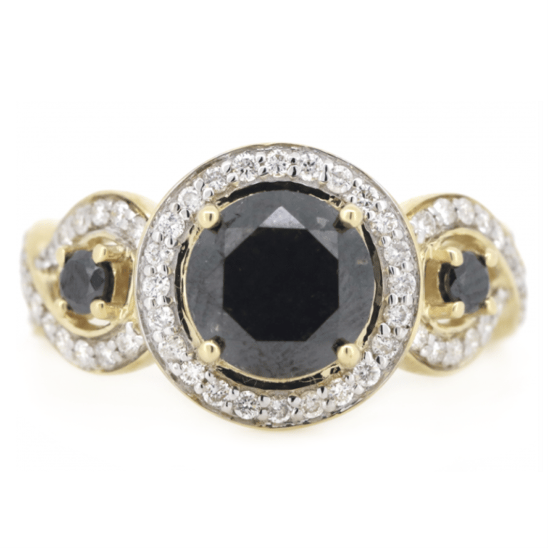 14K YELLOW GOLD, BLACK DIAMOND AND DIAMOND, HALO TRILOGY RING.