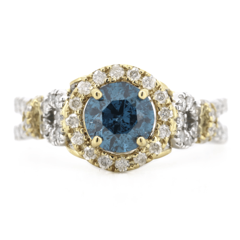 14K WHITE/YELLOW GOLD, FANCY BLUE DIAMOND AND DIAMOND, HALO SPLIT BAND RING.