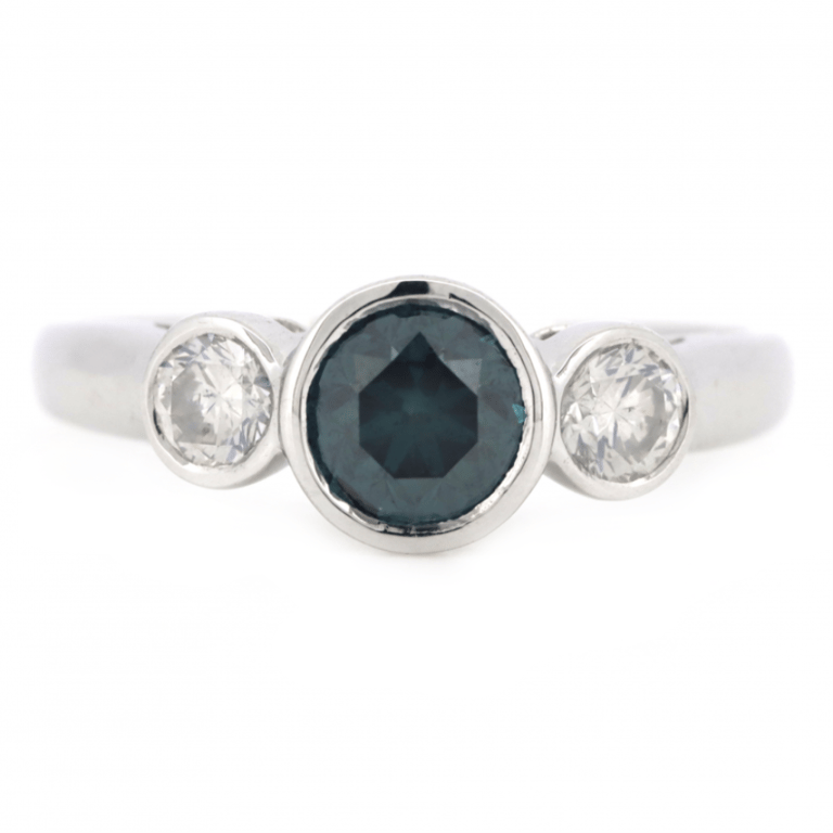 The Centre Features, One Round Brilliant Cut, Teal Blue, Diamond (1.00Ct, P2+ Clarity), Bezel Set. Flanking Either Side Are, 2 Round Brilliant Cut, Diamonds (0.43Ct Tdw, H -K Colour, P2+ Clarity), Bezel Set. Ring Size N 1/2.