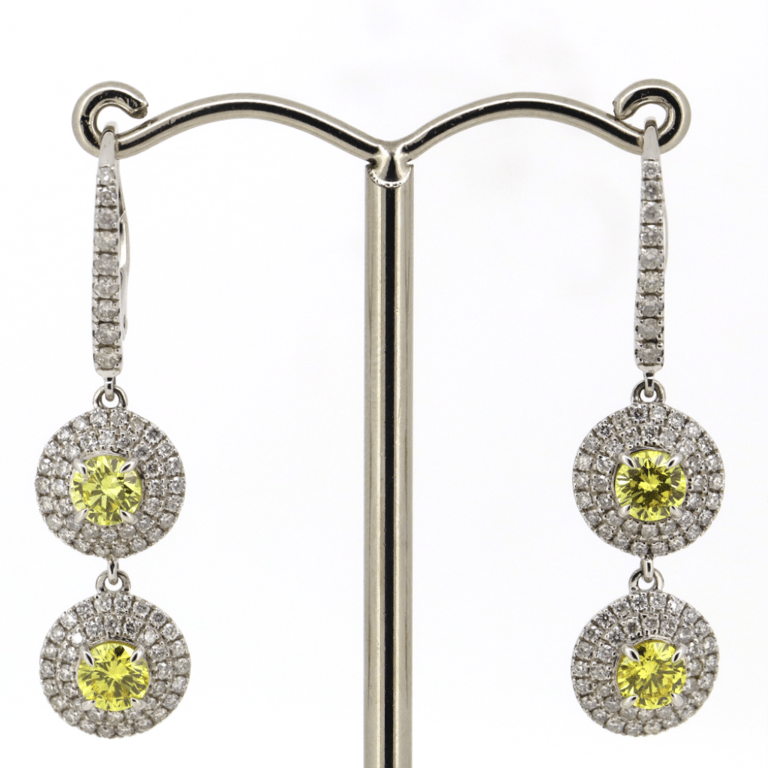 14K WHITE GOLD, FANCY YELLOW DIAMOND AND DIAMOND, HALO DOUBLE DROP EARRINGS. The Central Design Features, 4 Round Brilliant Cut, Intense Fancy Yellow, Diamonds (1.20Ct Tdw, Vs2 Clarity), 4 Claw Set. Encompassing The Design Are, 172 Round Brilliant Cut, Diamonds (0.98Ct Tdw, H-K Colour, P1+ Clarity), Micro-Bead Set. The Earrings Feature Shepherd Hooks With Spring Backs. Valuations Provided by an Independent Third-Party Professional Not Directly Associated With Lloyds Auctions at AUD $$30,000.00This valuation has been conducted by an independent third-party professional. The valuation amount is an assessment by the issuing valuer and does not reflect the auction value of the item. Any inquiries regarding the valuation should be directed to the issuing valuer (refer to contact details on the certificate), as Lloyds Auctions has no affiliation or influence over the valuation, the valuer, or the stated amount. Condition: Good - Refer Images 0645843+7052