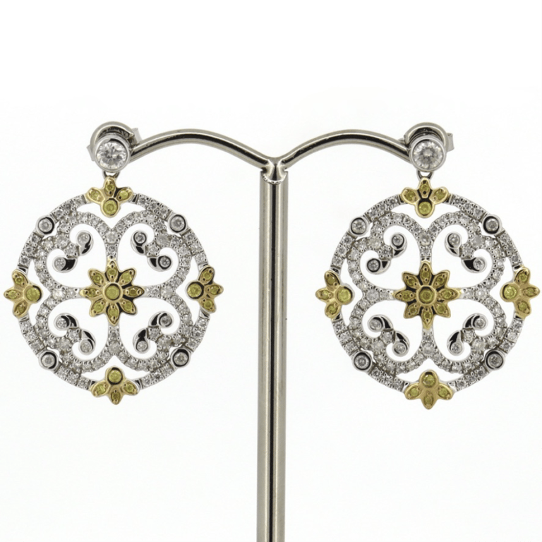 14K WHITE/YELLOW GOLD, FANCY YELLOW DIAMOND AND DIAMOND, DECORATIVE STUD EARRINGS. The Design Features, 50 Round Brilliant Cut, Light Fancy Yellow, Diamonds (0.265Ct Tdw, Si1-Si2 Clarity), Bezel/Micro-Bead Set. Encompassing The Design Are, 186 Round Brilliant Cut, Diamonds (1.175Ct Tdw, G-H Colour, Si1-Si2 Clarity), Micro-Bead, Bezel Set. The Earrings Have Post Backs, With 14K White Gold Butterfly Clasps. Valuations Provided by an Independent Third-Party Professional Not Directly Associated With Lloyds Auctions at AUD $$29,000.00This valuation has been conducted by an independent third-party professional. The valuation amount is an assessment by the issuing valuer and does not reflect the auction value of the item. Any inquiries regarding the valuation should be directed to the issuing valuer (refer to contact details on the certificate), as Lloyds Auctions has no affiliation or influence over the valuation, the valuer, or the stated amount. Condition: Good - Refer Images 0645843+7014