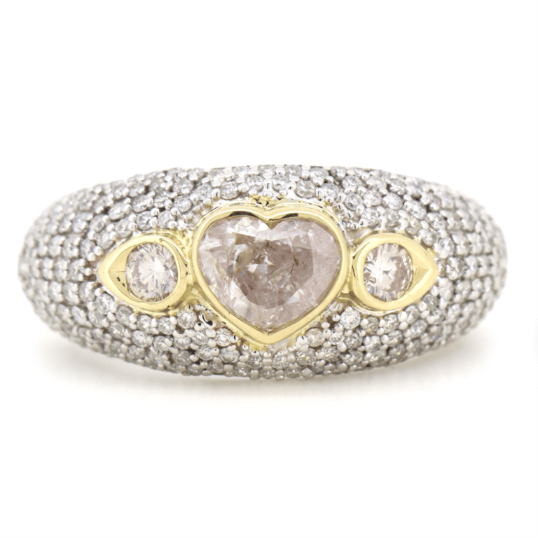 The Centre Features, One Modified Heart Cut, Fancy Faint Pink, Diamond (1.006Ct, I3+), Bezel Set. Flanking The Centre Diamond Are, 2 Round Brilliant Cut, Fancy Faint Pink, Diamonds (0.06Ct Tdw, I3+), Bezel Set. Encompassing The Centre In A Cluster Are, 200 Round Brilliant Cut, Diamonds (0.88Ct Tdw, G-H Colour, Si1-Si2 Clarity), Micro-Pave Set. Ring Size M 1/2.