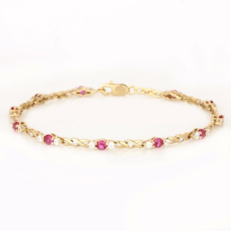 Exquisite 9K Yellow Gold Bracelet Adorned with Ruby and Diamond EleganceIndulge in the epitome of luxury with this stunning 9K Yellow Gold Bracelet, a masterful creation that effortlessly merges timeless elegance with contemporary flair. Crafted from lustrous yellow gold, this bracelet is a radiant testament to fine jewelry artistry, featuring a harmonious blend of vibrant rubies and sparkling diamonds that will surely captivate any admirer.At its heart, eleven mesmerizing round rubies, each measuring 3.00mm, boast a rich crimson hue that exudes passion and sophistication. These precious stones are artfully complemented by a dazzling array of twenty-two round white diamonds, each 1.80mm in size, showcasing exceptional clarity (SI-2) and a brilliant HI color grade. The diamond accents are further enhanced by an additional eleven 1.00mm diamonds, creating a breathtaking cascade of light and brilliance that dances with every movement.The bracelet is elegantly finished with a white pen rhodium plating, adding a touch of contemporary shine that elevates its overall allure. Securely fastened with a robust lobster lock, this piece is designed not only for beauty but also for comfort and wearability.Perfect for both special occasions and everyday elegance, this 9K yellow gold bracelet is a luxurious statement piece that reflects your exquisite taste. Adorn your wrist with this exquisite creation and let it tell a story of elegance and charm. Don't miss the chance to make this breathtaking piece a part of your jewelry collection.