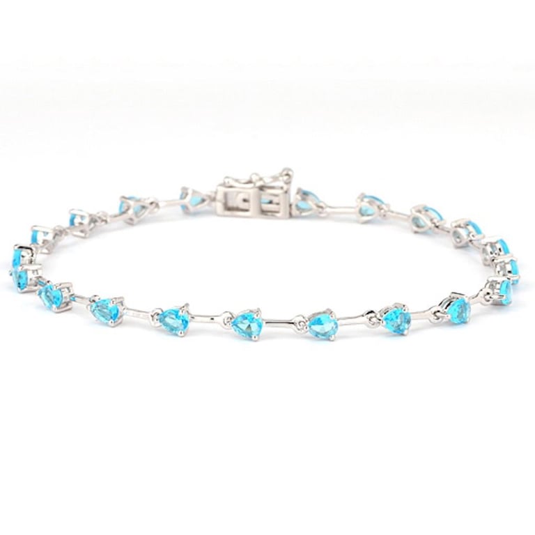 Ethereal Elegance: 9K White Gold Aquamarine Pear BraceletIndulge in the serene beauty of this exquisite 9K white gold bracelet, artfully adorned with 21 shimmering aquamarine pears, each measuring 4x3mm. This single-line Gibbi masterpiece is a harmonious blend of contemporary design and timeless elegance, perfect for the discerning jewelry lover.The tranquil hues of aquamarine evoke the calming essence of the ocean, capturing light with every movement and radiating a sense of peace and tranquility. Each pear-shaped gemstone is meticulously set in lustrous white gold, enhancing the bracelet's sophistication while ensuring a secure and comfortable fit. Whether worn as an everyday accent or for special occasions, this bracelet is a versatile addition to any jewelry collection. Its delicate allure makes it an ideal gift for someone special or a luxurious treat for yourself. Elevate your style and embrace the elegance of this enchanting piece, where modern artistry meets the ethereal charm of nature. Don’t miss the opportunity to own this timeless treasure.