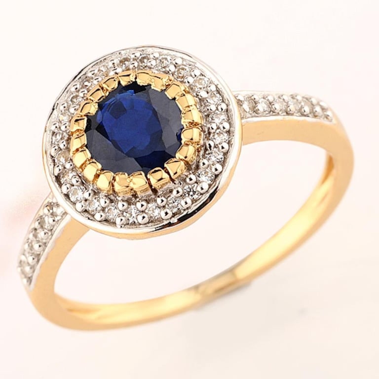 Indulge in the timeless elegance of this stunning 9K yellow gold ring, a masterpiece that beautifully marries sophistication with a touch of opulence. At its heart lies a mesmerizing round blue sapphire, measuring 6.00mm, radiating an enchanting deep hue that captures the essence of luxury. This exquisite gemstone is delicately framed by a halo of 36 glistening white diamonds, each expertly set to enhance their brilliance and sparkle.