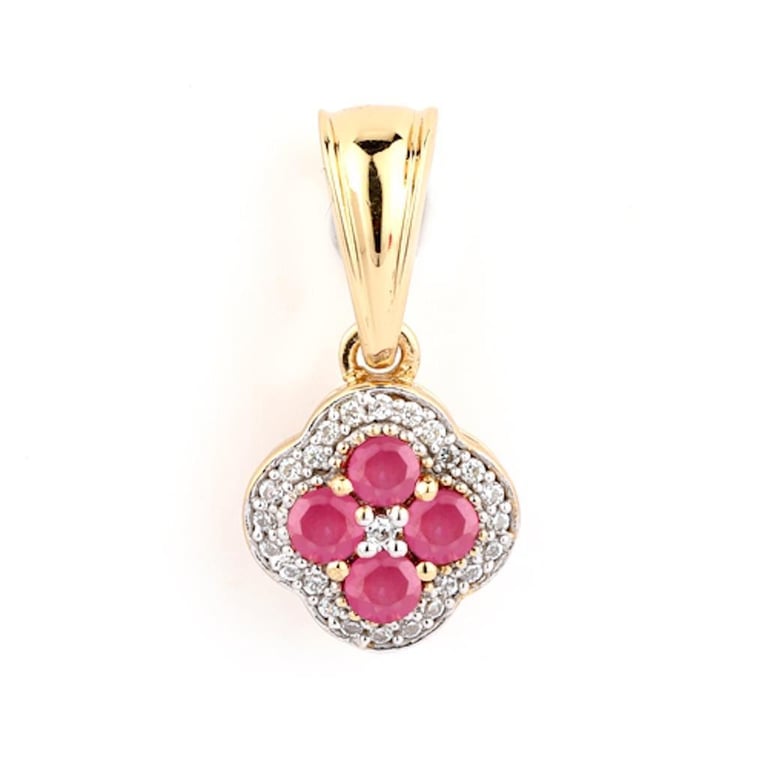 Exquisite 9K Yellow Gold Pendant Adorned with Radiant Rubies and Dazzling White DiamondsIndulge in the epitome of elegance with this stunning pendant crafted in 9K yellow gold, a timeless piece that effortlessly combines vibrant gemstones with luxurious design. This exquisite pendant features four lustrous round rubies, each measuring 2.50mm, that radiate a rich crimson hue, symbolizing passion and vitality. Complementing these captivating rubies are 25 scintillating white diamonds—one impressive 1.00mm diamond and an array of 24 sparkling 0.80mm diamonds, all graded SI-2/HI for exceptional brilliance and clarity.The pendant is skillfully enhanced with a white pen rhodium finish, adding an alluring contrast to the warm tones of the yellow gold while elevating the overall aesthetic. This masterpiece, designed for versatility and grace, is perfect for any occasion, whether worn alone or paired with your favorite chain. A statement of sophistication, this pendant is not just a piece of jewelry; it is a cherished keepsake waiting to be adored. Don’t miss the opportunity to own this exquisite treasure that promises to illuminate any jewelry collection with its enchanting sparkle.