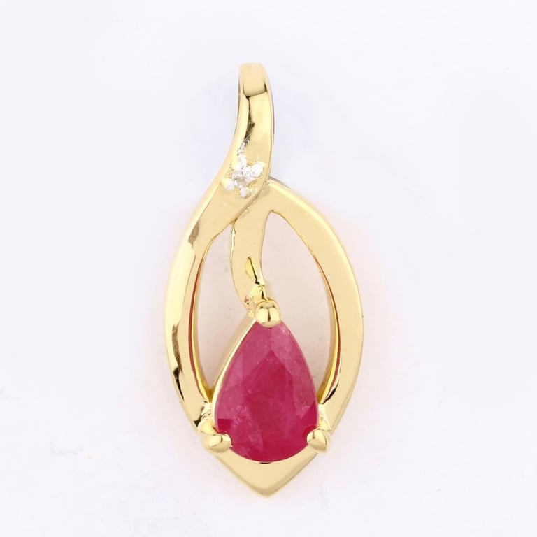 Indulge in the timeless elegance of this stunning 9K yellow gold pendant, a true masterpiece that captures the essence of sophistication and allure. Showcasing a vibrant pear-shaped ruby measuring 6x4mm, this captivating gemstone radiates a rich crimson hue that is both passionate and enchanting. Flanked by sparkling white diamonds, each with a delicate 1.00mm round cut, this pendant exudes a brilliance that dances with every movement.