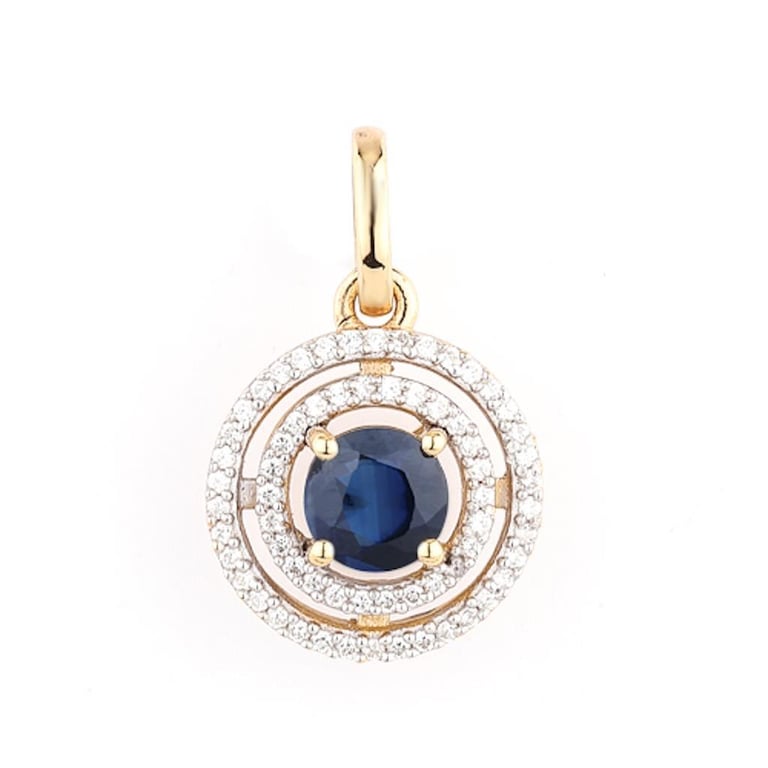 Indulge in the essence of elegance with this stunning 9K yellow gold pendant, a true testament to luxury and craftsmanship. Featuring a captivating round blue sapphire of 5.00mm, the centerpiece exudes a deep, oceanic hue that draws the eye and captivates the heart. Surrounding this vivid gemstone are 64 shimmering white diamonds, each meticulously selected for their quality (SI-2 clarity and HI color), totaling 0.80mm in size. The diamonds are expertly set to enhance their brilliance, creating a dazzling halo that accentuates the sapphire's allure.