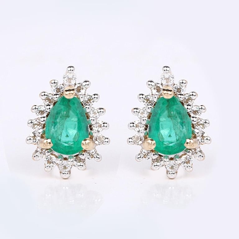 Indulge in the elegance of these stunning 9K yellow gold earrings, where nature’s beauty meets exquisite craftsmanship. Each earring features a captivating Zambian emerald pear, measuring 6x4mm, exuding a rich green hue that evokes the lush landscapes of its origin. Complementing the vibrant emeralds are 32 brilliant white diamonds, each round and 1.00mm in size, that shimmer with a clarity classified as SI-2/HI. These diamonds encircle the emeralds with a captivating sparkle, enhancing their allure.