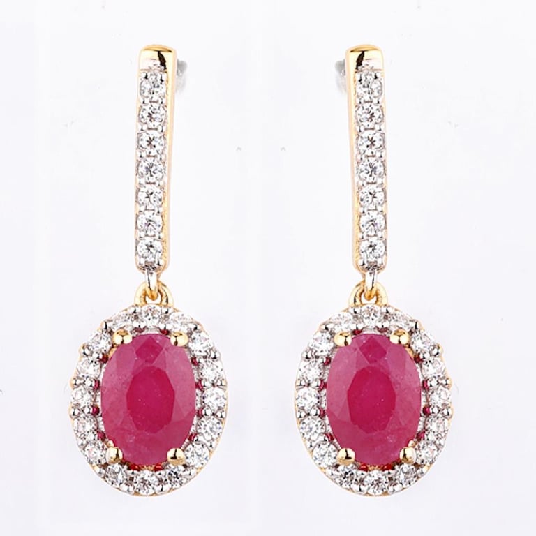 Exquisite 9K Yellow Gold Ruby and Diamond EarringsIndulge in the captivating allure of these stunning earrings, crafted from luxurious 9K yellow gold that radiates warmth and elegance. Each piece features a striking oval-cut ruby, measuring 7x5mm, that exudes a rich, velvety red hue, symbolizing passion and vitality. Enhanced by a scintillating halo of 46 round white diamonds, totaling 1.30mm each, these earrings are designed to dazzle with every movement.The high-quality diamonds, graded SI-2 for clarity and HI for color, provide a brilliant contrast to the deep reds of the rubies, ensuring that your look is both sophisticated and eye-catching. The earrings are finished with a white pen rhodium plating, adding a contemporary touch of shine and ensuring lasting beauty.Designed with a secure push post fastening, these earrings are not just a statement piece but also a comfortable choice for all-day wear. Perfect for both special occasions and everyday elegance, they will elevate any outfit with their timeless charm. Embrace the luxury of these exquisite earrings and let them become a cherished addition to your jewelry collection.