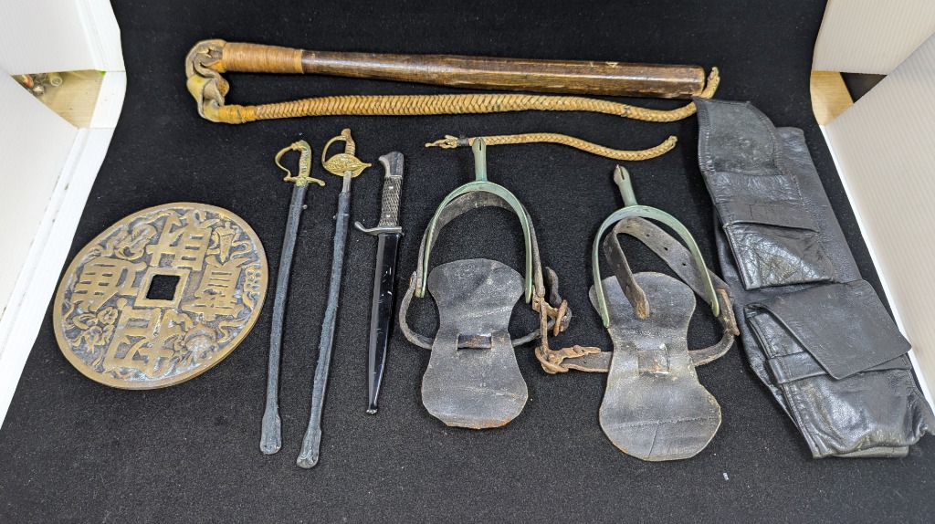 COLLECTION OF HORSE RIDING ITEMS, MINIATURE SWORDS AND CHINESE STYLE MEDALLION Whip End Broken Condition: Fair - Refer To Images 584909+6