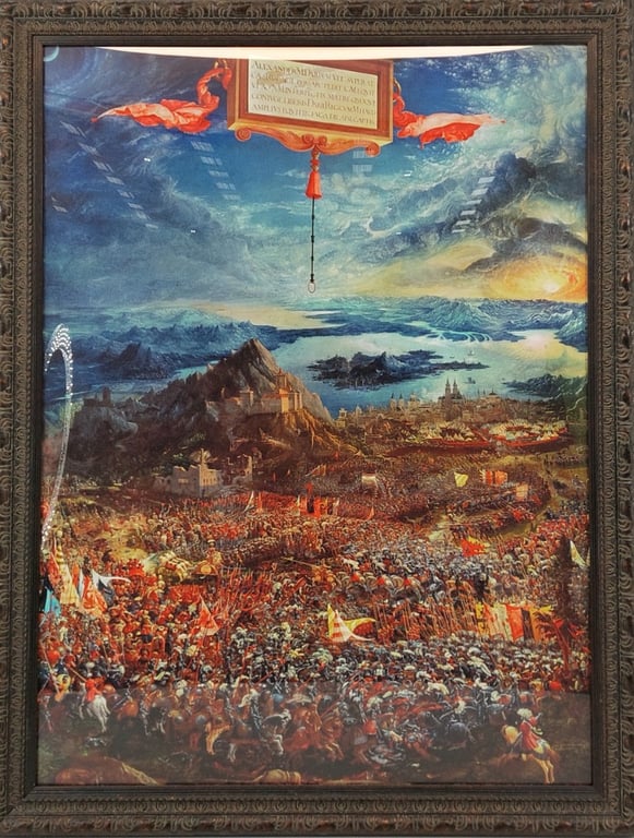 A FRAMED POSTER OF THE BATTLE OF ALEXANDER AT ISSUS BY ALBRECHT ALTDORFER