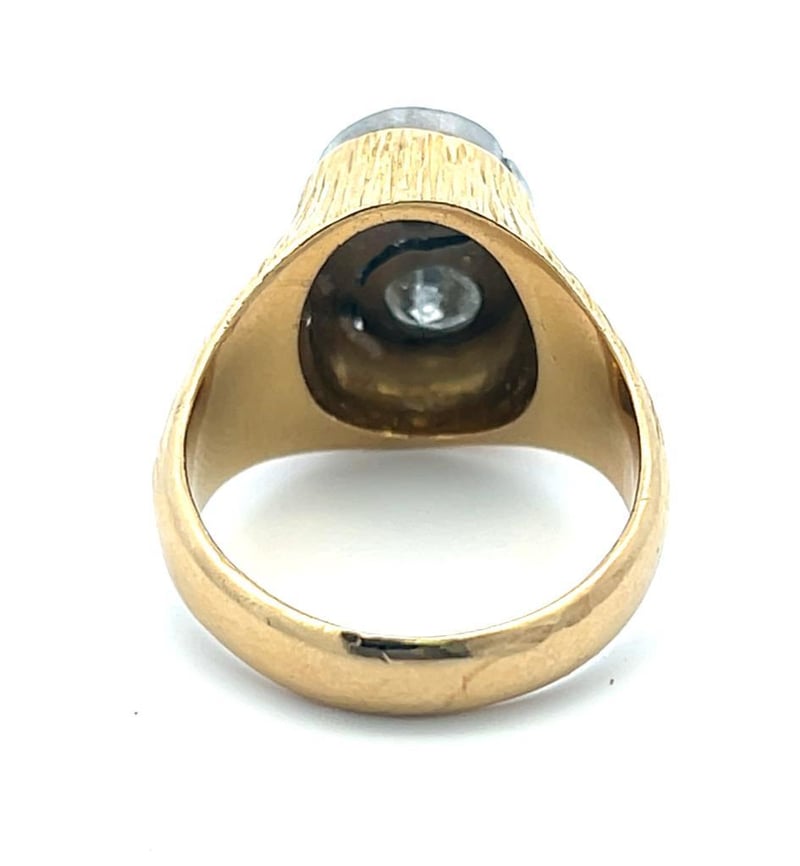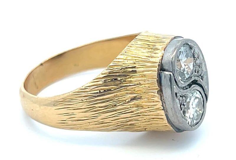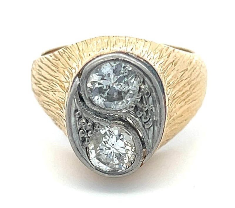 18CT YELLOW & WHITE GOLD 1.40CT DIAMOND MEN'S RING, 2 ROUND BRILLIANT CUT DIAMONDS PART CLAW/RUB OVER SET IN WHITE GOLD WITH BEAD EDGING, BARK TEXTURE GOLD PATTERN TOP HALF OF BAND, ESTIMATE TOTAL DIAMOND WEIGHT 1.40CT, STAMP 18CT, RING WEIGHT 15.07 GRAMS. THIS ITEM HAS BEEN PROFESSIONALLY VERIFIED AS A GENUINE PRODUCT AND COMES WITH ACCOMPANYING 3RD PARTY CERTIFICATE OF AUTHENTICITY Condition: Good - Refer To Images