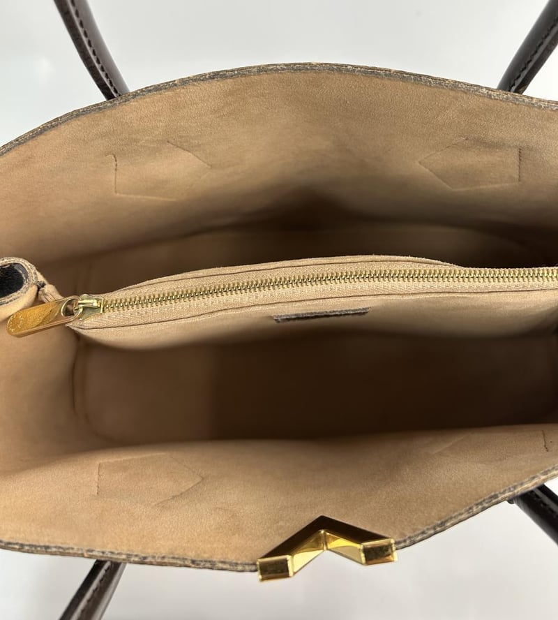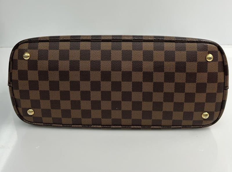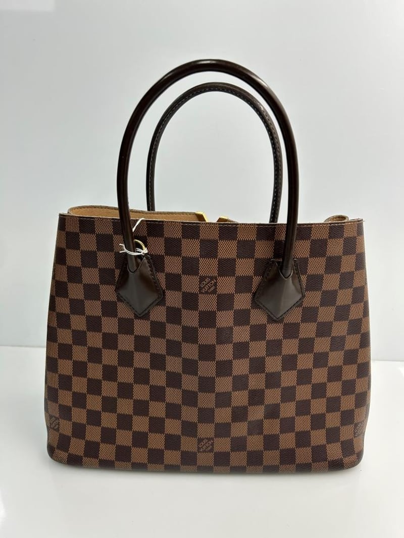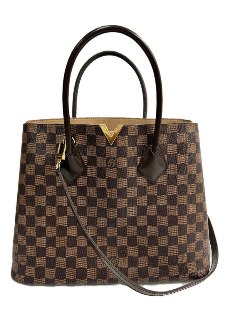 LOUIS VUITTON KENSINGTON DAMIER HANDBAG, BROWN COWHIDE LEATHER AND DAMIER EBENE COATED CANVAS, GOLD-TONE HARDWARE, 2 TOP HANDLES, REMOVABLE SHOULDER STRAP, DOME CLOSURE SIDES, BEIGE MICROFIBRE LINING, 2 COMPARTMENTS WITH CENTRE ZIP POCKET, BAG MEASURES 34 X 26 X 15CM, MADE IN FRANCE. THIS ITEM HAS BEEN PROFESSIONALLY VERIFIED AS A GENUINE PRODUCT AND COMES WITH ACCOMPANYING 3RD PARTY CERTIFICATE OF AUTHENTICITY Condition: Good - Refer To Images
