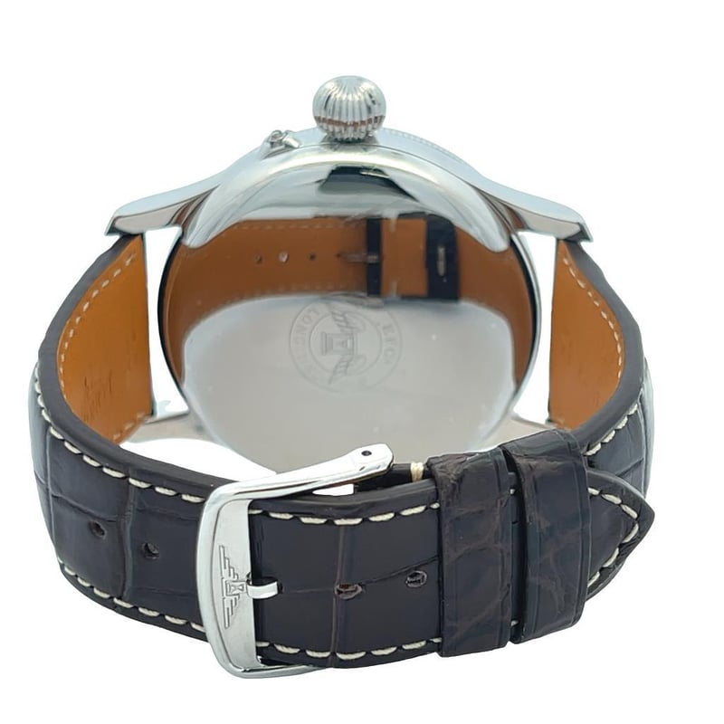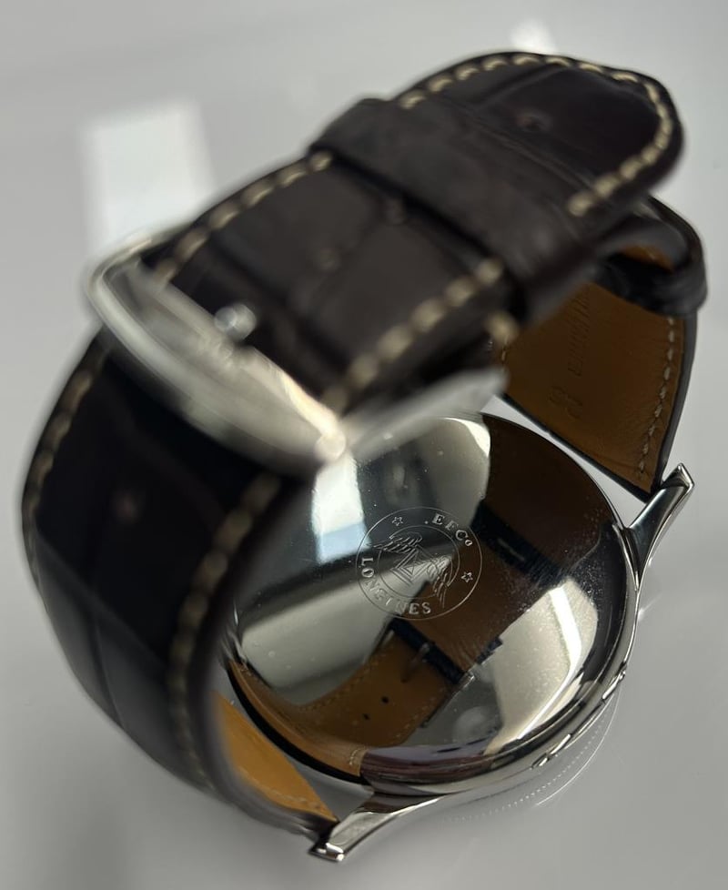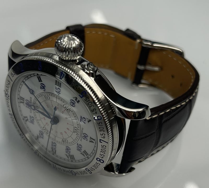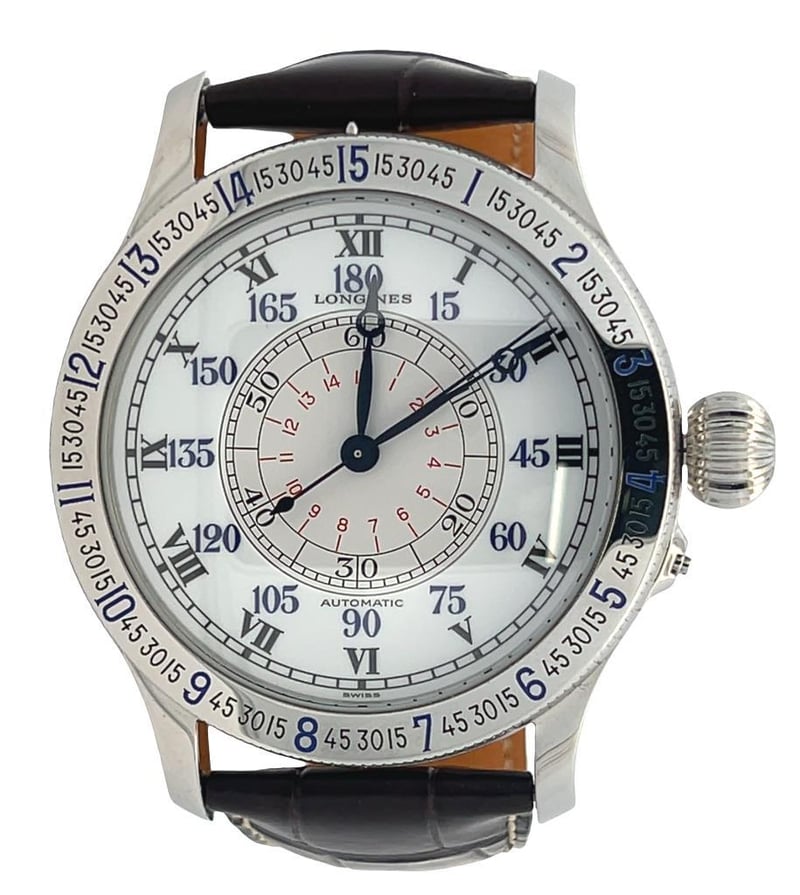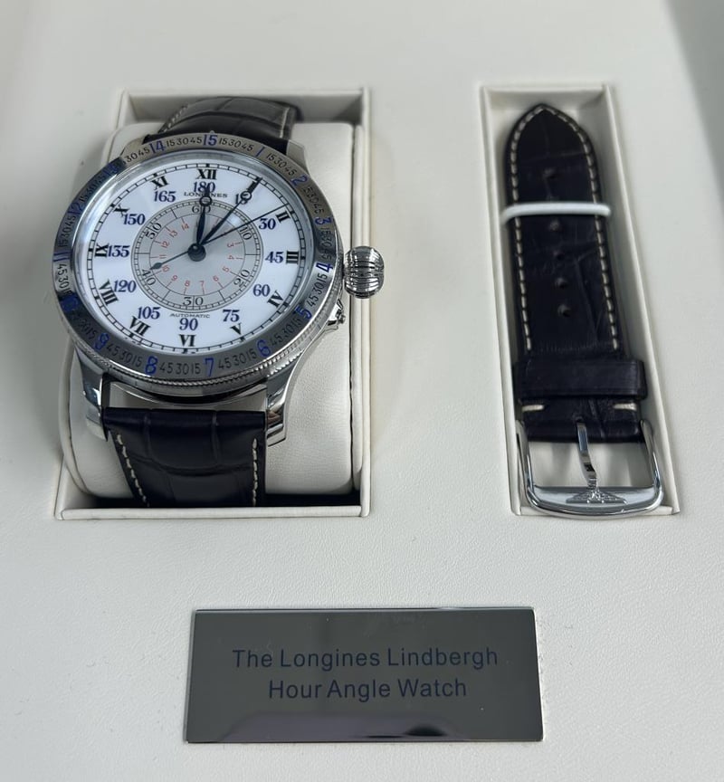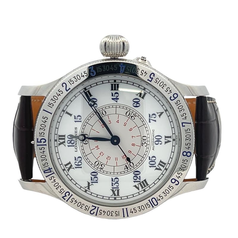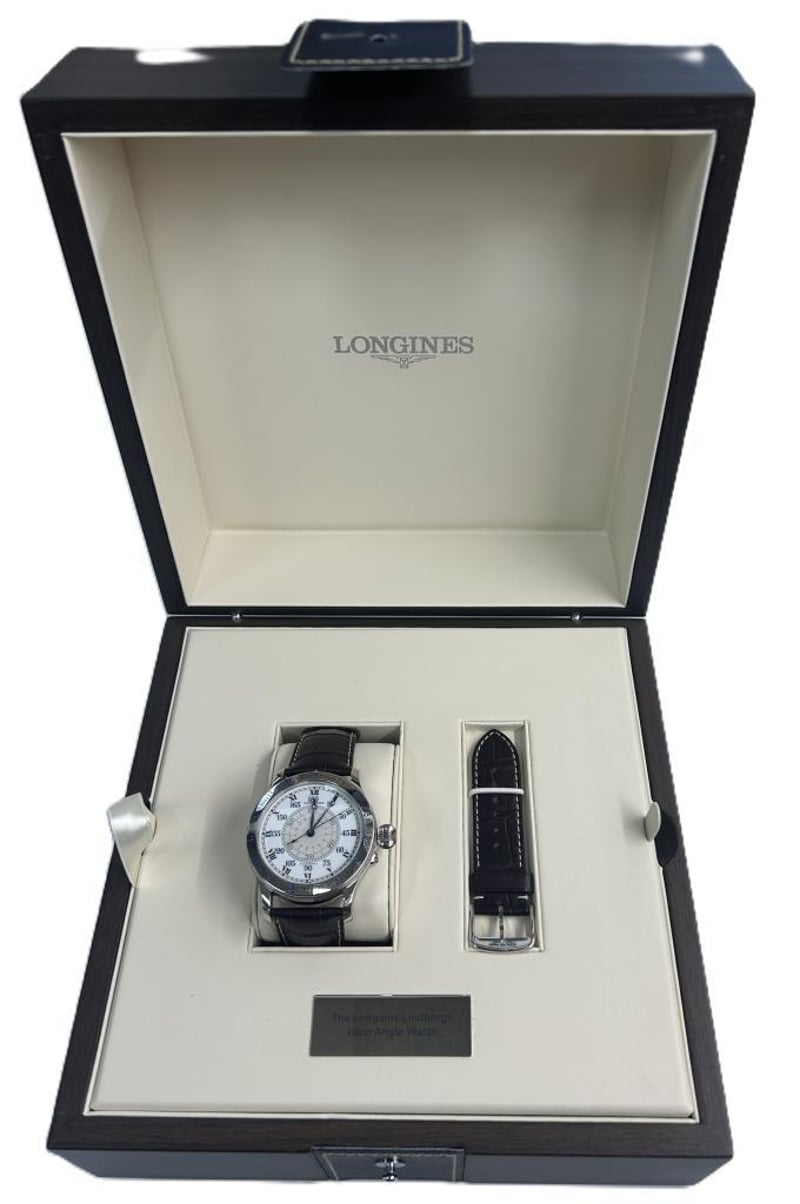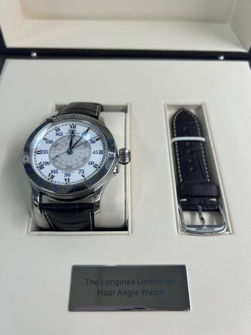 LONGINES LINDBERGH HOUR ANGLE WATCH, MODEL L2.678.4.11.0, SILVER DIAL WITH BLUED STEEL HANDS AND ROTATING BEZEL WITH HOUR ANGLE SCALE, CASE SIZE 47.5MM, SWISS AUTOMATIC MOVEMENT CALIBRE L699.2 WITH 46-HOUR POWER RESERVE, SAPPHIRE CRYSTAL WITH HINGED HUNTER CASE BACK ENGRAVED “DESIGNED BY COL. CHARLES A. LINDBERGH,” STAINLESS STEEL CASE, BROWN CALF LEATHER STRAP WITH BUCKLE, WATER RESISTANT TO 30M, INCLUDES ORIGINAL LONGINES BOX AND DOCUMENTATION, EXCELLENT CONDITION WITH MINIMAL WEAR.