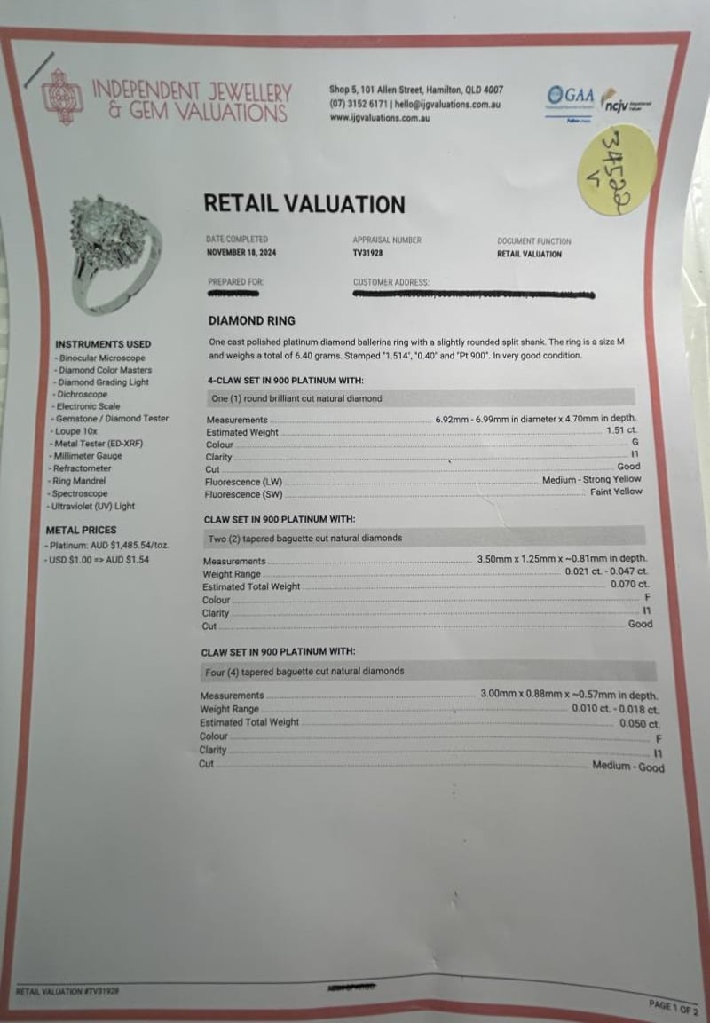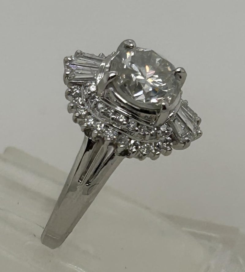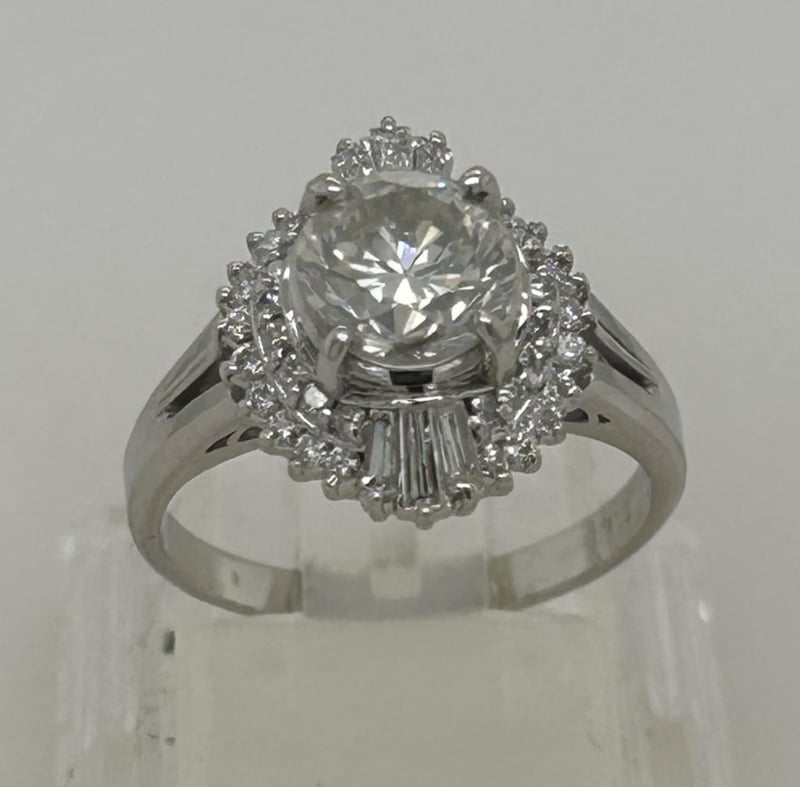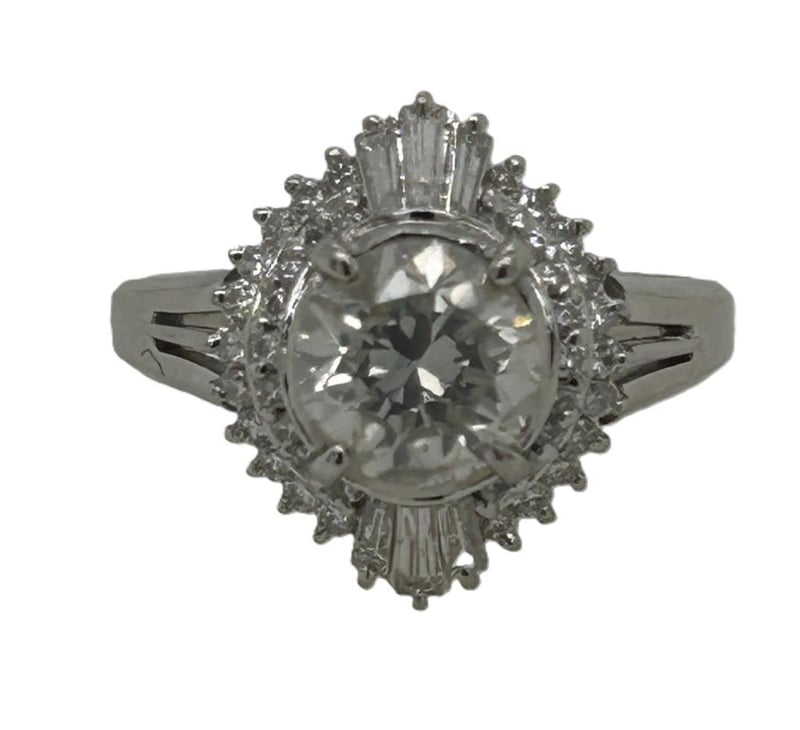PLATINUM 1.90CT DIAMOND BALLERINA CLUSTER RING, CENTRE 1.51CT ROUND BRILLIANT CUT DIAMOND 4 CLAW SET SURROUND BY 22 & 18 ROUND BRILLIANT CUT DIAMONDS GRAIN SET AND 6 TAPERED BAGUETTE DIAMONDS CLAW SET, TOTAL DIAMOND WEIGHT 1.90CT F-G I1, RING WEIGHT 6.40 GRAMS, STAMP PT900. THIS ITEM HAS BEEN PROFESSIONALLY VERIFIED AS A GENUINE PRODUCT AND COMES WITH ACCOMPANYING 3RD PARTY VALUATION $24,645.00