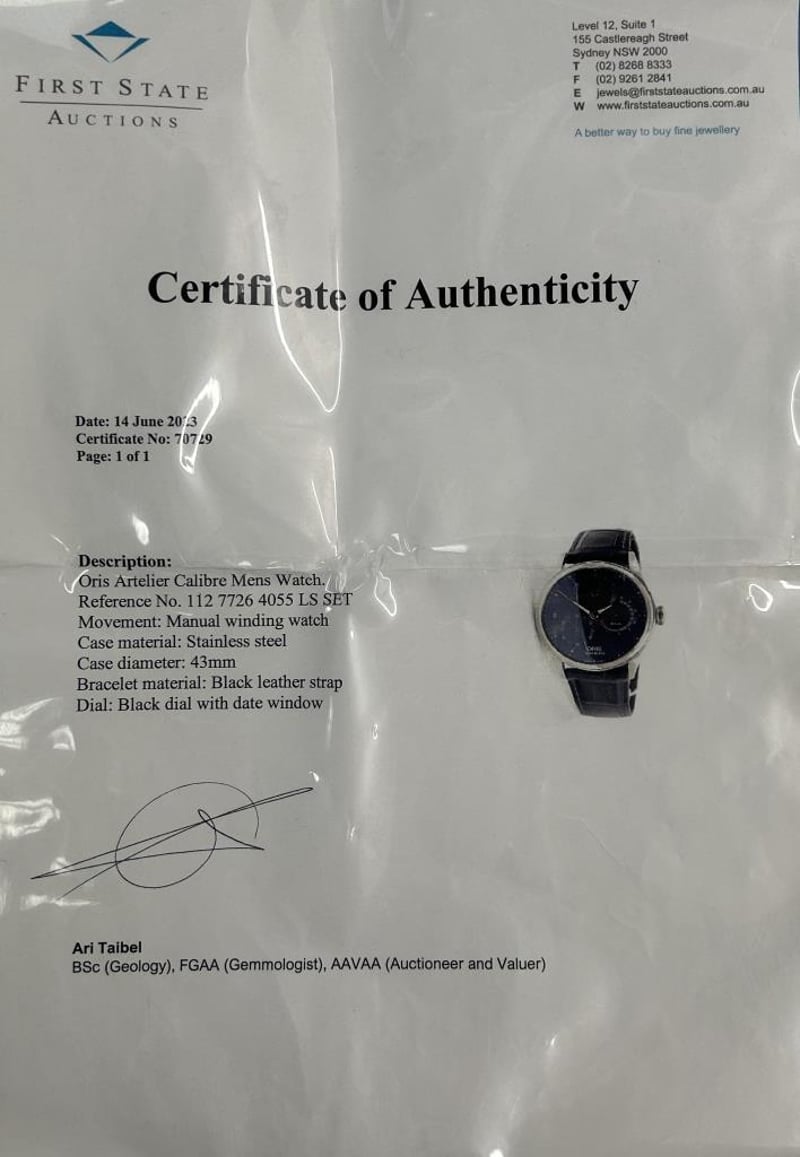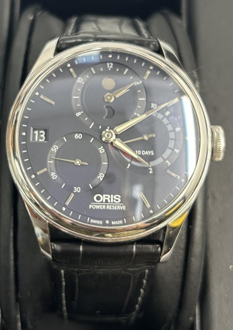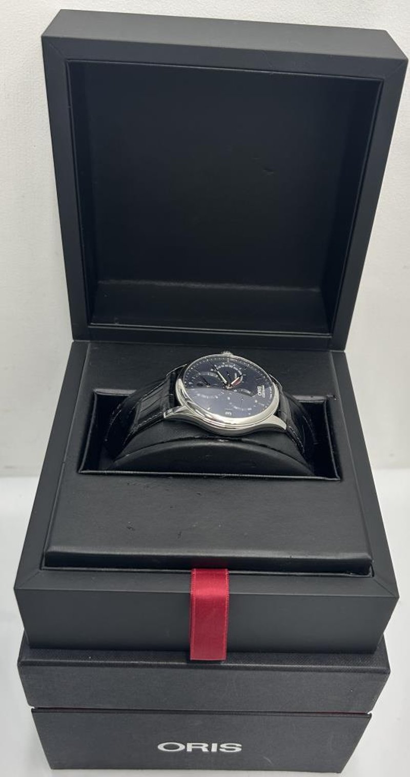 ORIS ARTELIER CALIBRE 112 POWER RESERVE WATCH, REFERENCE 7726 4055 LS SET, BLUE DIAL WITH DATE AND MOONPHASE DISPLAY, 10-DAY POWER RESERVE INDICATOR, CASE MEASURES 43MM, WR 3 ATM, SWISS MADE, MANUAL-WIND MECHANICAL MOVEMENT, STAINLESS STEEL CASE WITH BLACK LEATHER STRAP AND DEPLOYANT CLASP, INCLUDES ORIGINAL ORIS BOX AND CERTIFICATE OF AUTHENTICITY.
