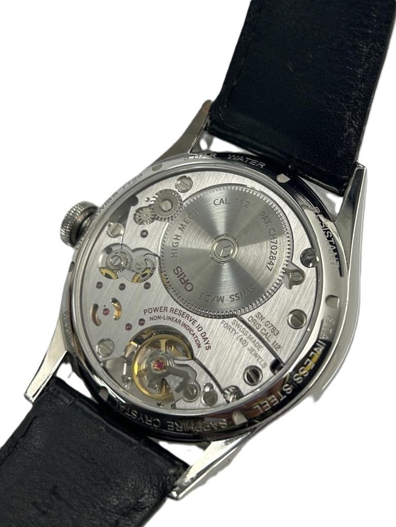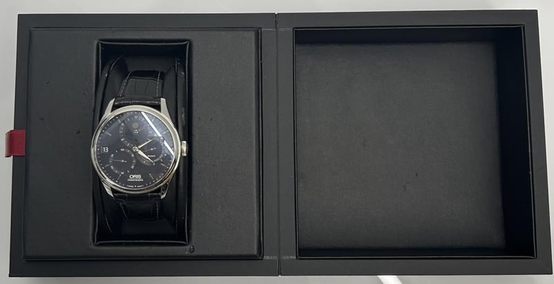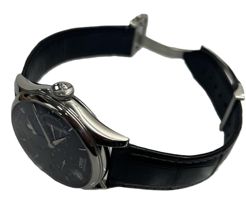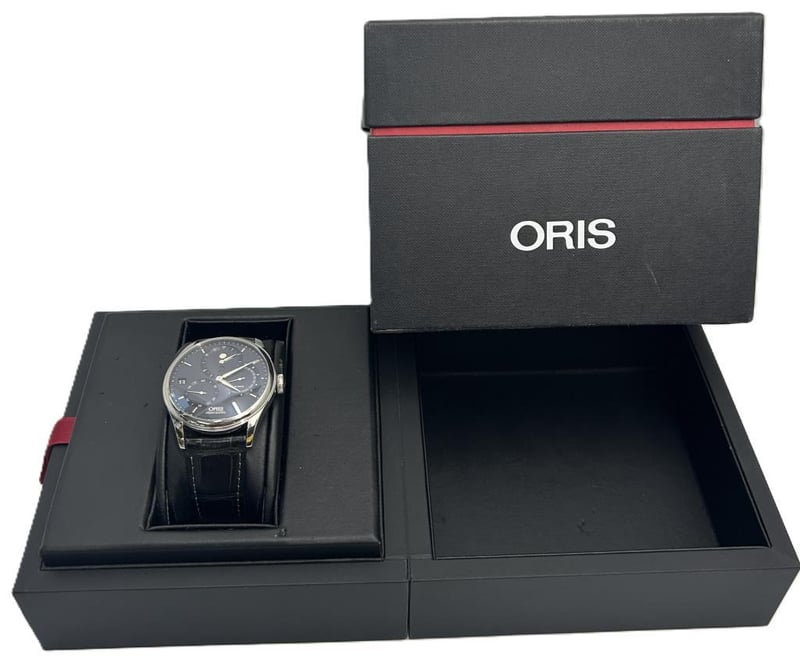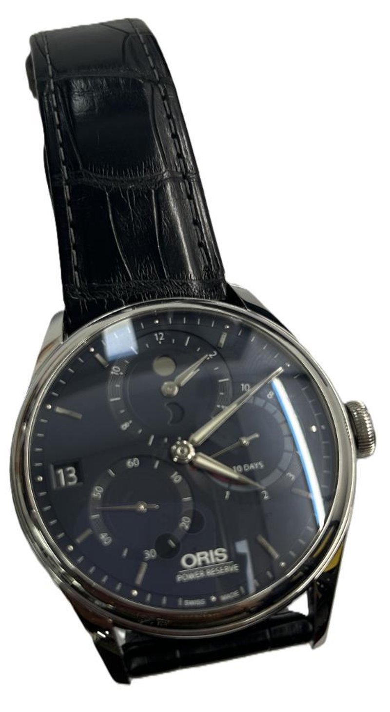 ORIS ARTELIER CALIBRE 112 POWER RESERVE WATCH, REFERENCE 7726 4055 LS SET, BLUE DIAL WITH DATE AND MOONPHASE DISPLAY, 10-DAY POWER RESERVE INDICATOR, CASE MEASURES 43MM, WR 3 ATM, SWISS MADE, MANUAL-WIND MECHANICAL MOVEMENT, STAINLESS STEEL CASE WITH BLACK LEATHER STRAP AND DEPLOYANT CLASP, INCLUDES ORIGINAL ORIS BOX AND CERTIFICATE OF AUTHENTICITY.