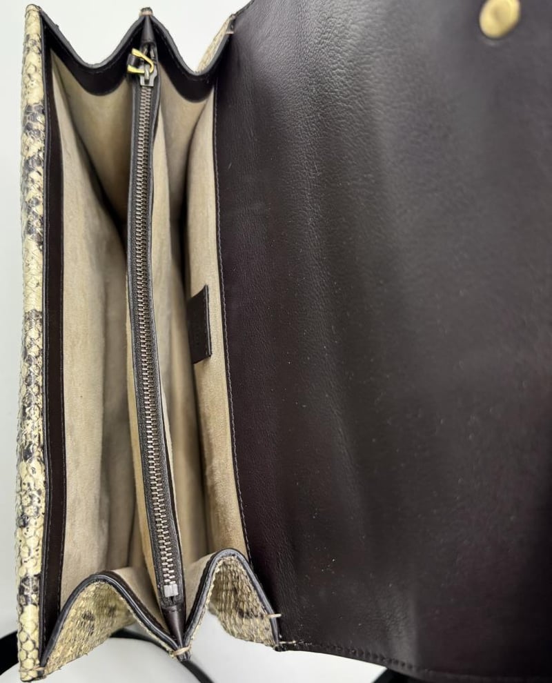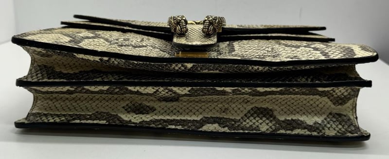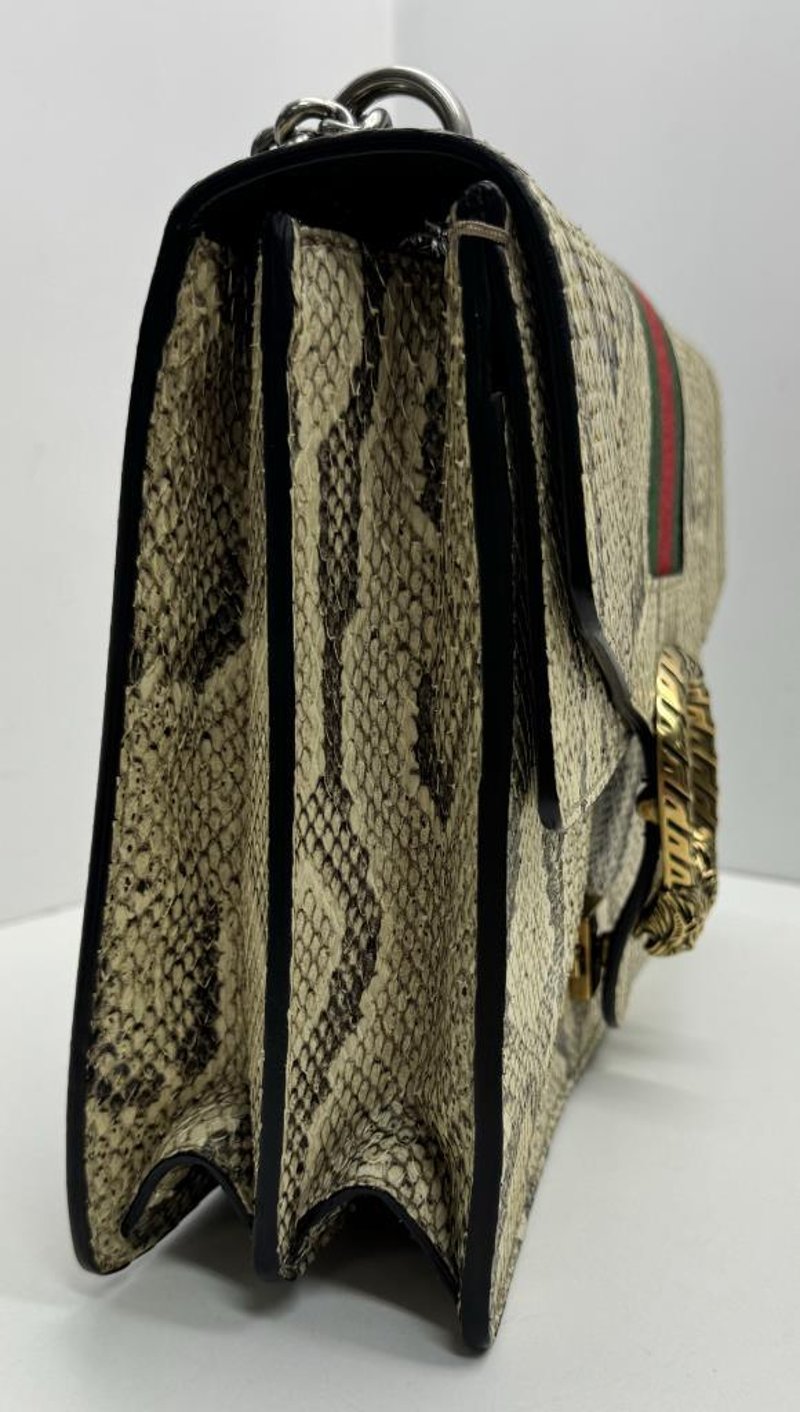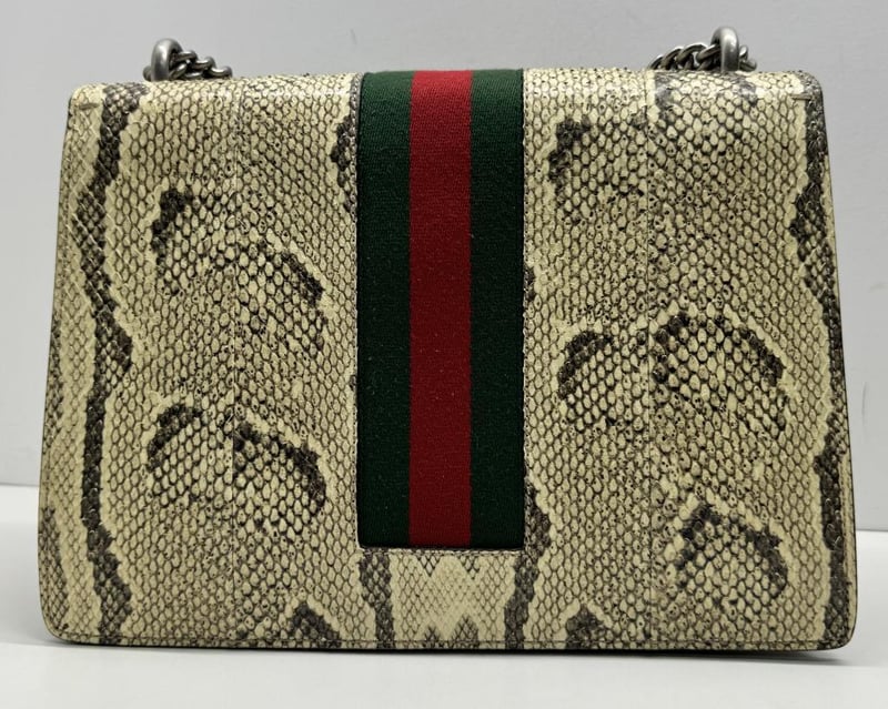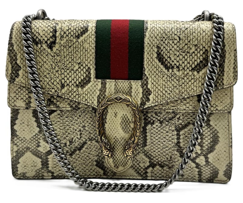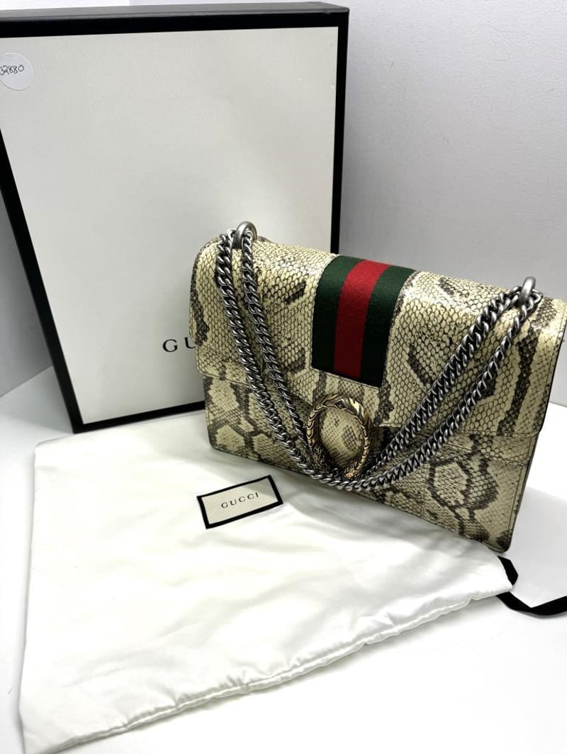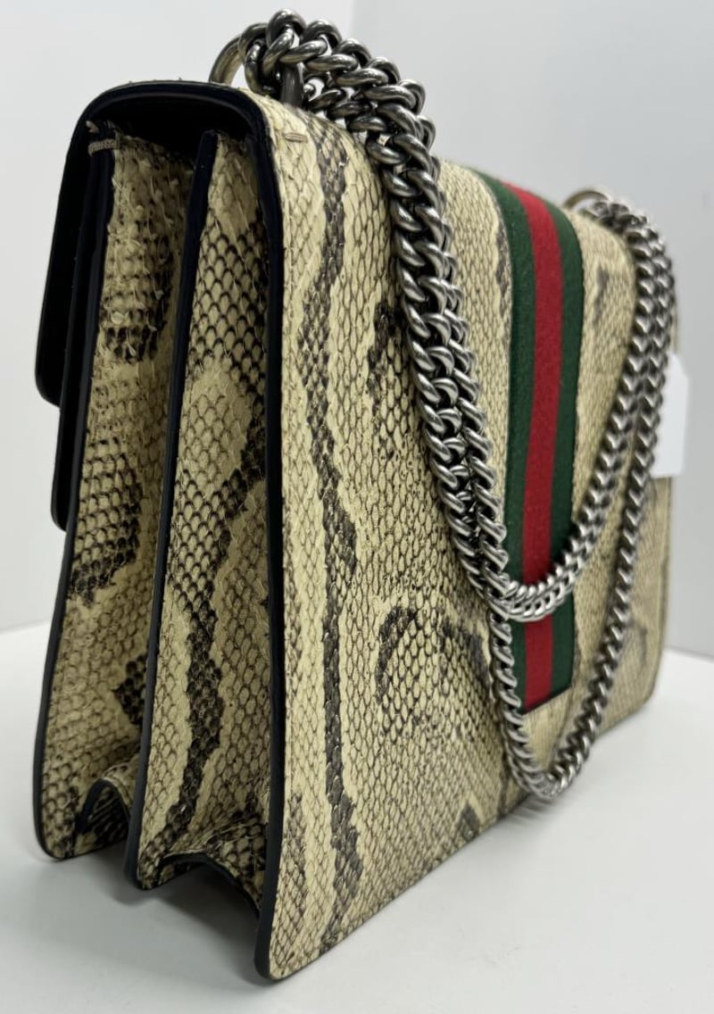 GUCCI PYTHON DIONYSUS HANDBAG, SNAKESKIN & WEB STRIPE DESIGN WITH GOLD & SILVER TONE CHAIN SHOULDER STRAP, FOLD OVER FLAP WITH GOLD-TONE SPUR & PUSH BUTTON CLOSURE, BROWN LEATHER & SUEDE LINING, FOLD OVER FLAP POCKET, 2 COMPARTMENTS & MIDDLE ZIP POCKET. BAG MEASURES 30 X 22 X 9.0CM, MADE IN ITALY, INCLUDES DUST COVER & BOX. THIS ITEM HAS BEEN PROFESSIONALLY VERIFIED AS A GENUINE PRODUCT AND COMES WITH ACCOMPANYING 3RD PARTY CERTIFICATE OF AUTHENTICITY