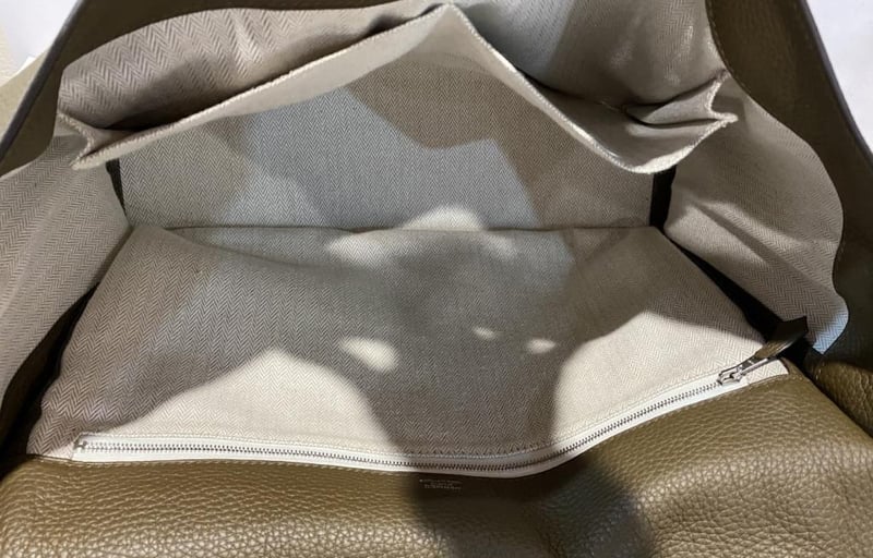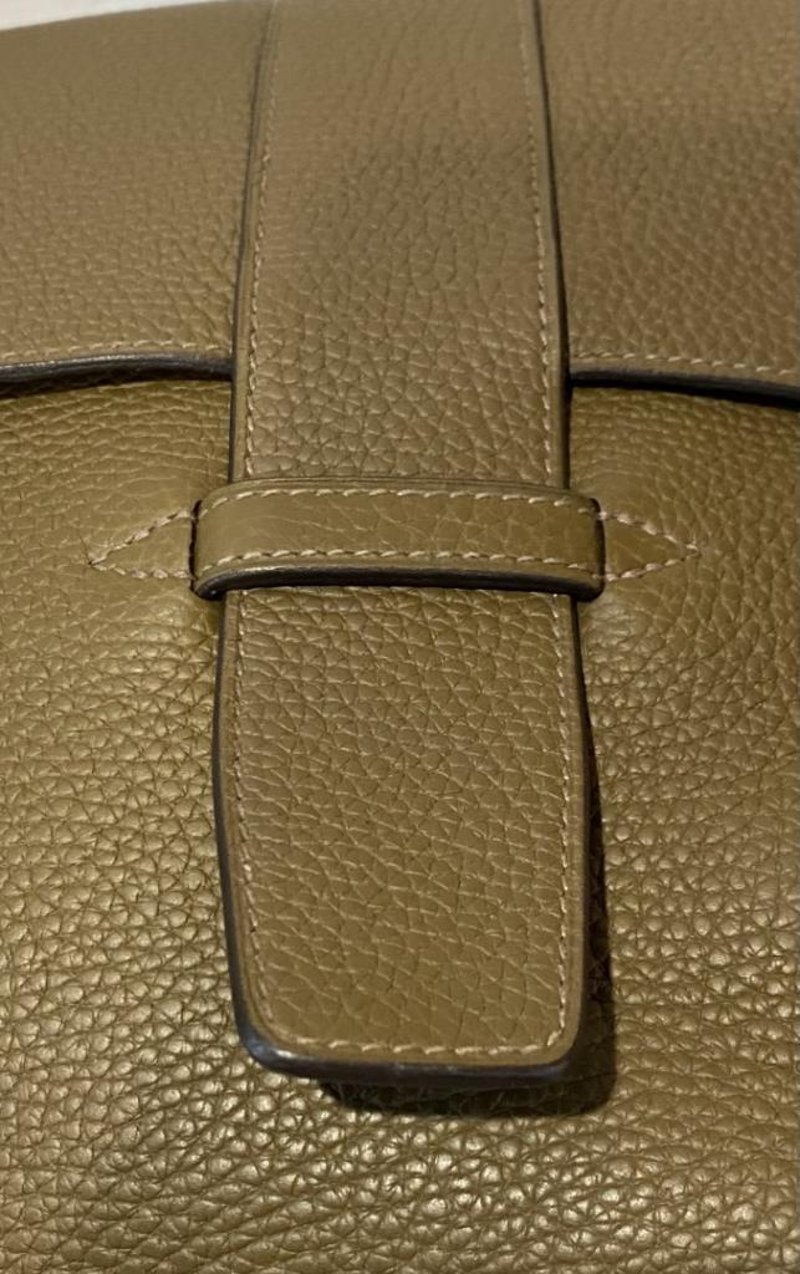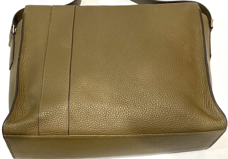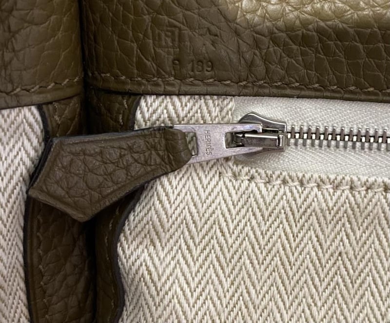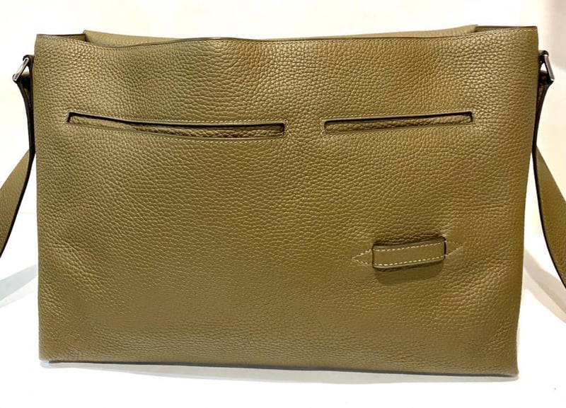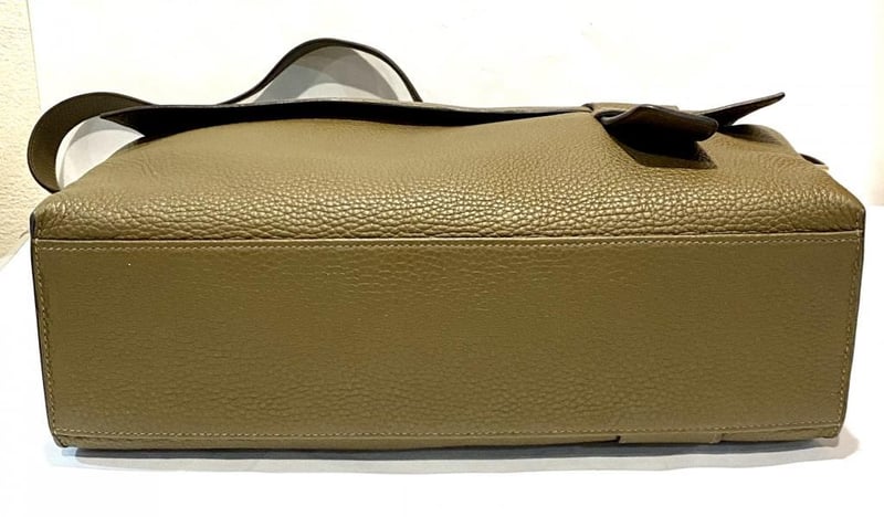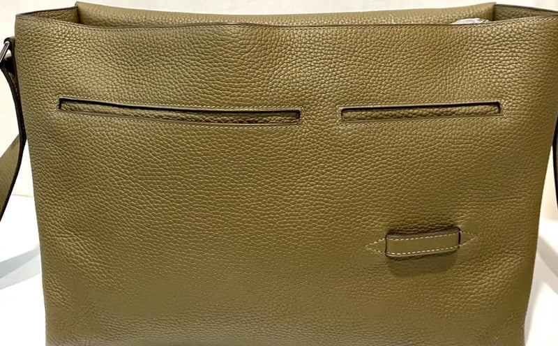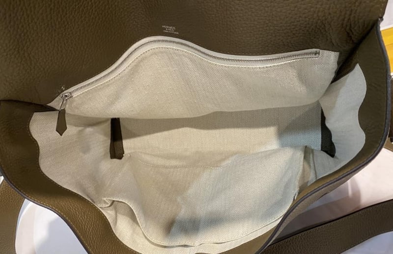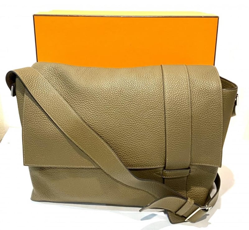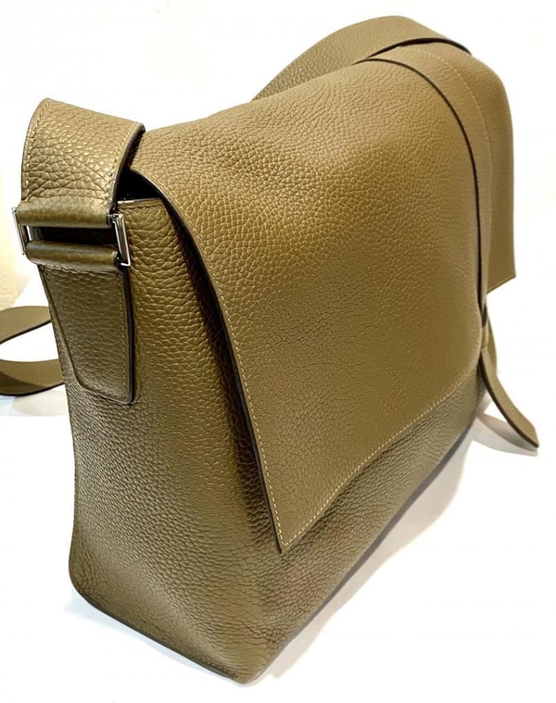 HERMES CLEMENCE ALFRED 35 MESSENGER BAG, BROWN/KHAKI CALFSKIN LEATHER, FRONT FLAP SLIP CLOSURE, 2 SLIP POCKETS UNDER FRONT FLAP, ECRU NEUTRAL TOILE CHEVRON INTERIOR WITH SIDE ZIP & SLIP POCKETS, MEASURES 35 X 25 X 10CM, ADJUSTABLE SHOULDER STRAP, MADE IN FRANCE, ORIGINAL BOX. THIS ITEM HAS BEEN PROFESSIONALLY VERIFIED AS A GENUINE PRODUCT AND COMES WITH ACCOMPANYING 3RD PARTY CERTIFICATE OF AUTHENTICITY