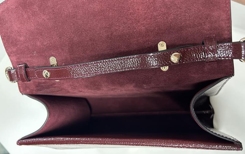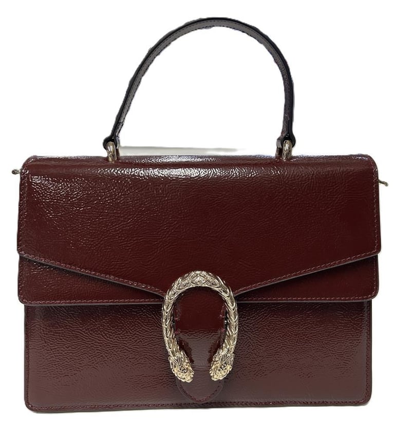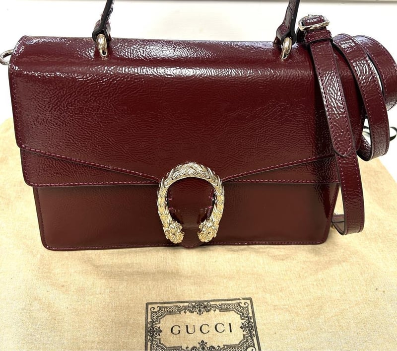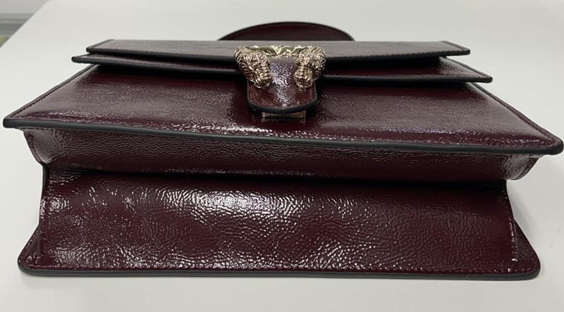 GUCCI DIONYSUS ROSSO ANCORA PATENT LEATHER SHOULDER BAG, GOLD-TONE HARDWARE, SINGLE TOP FLAT HANDLE, REMOVABLE & ADJUSTABLE SHOULDER STRAP, FRONT FLAP WITH TEXTURED TIGER HEAD CLOSURE, ROUGE RED SUEDE LINING WITH FRONT FLAP POCKET & SEPARATE MAIN COMPARTMENT, BAG MEASURES W29XH20XD9CM, MADE IN ITALY, DUST COVER. THIS ITEM HAS BEEN PROFESSIONALLY VERIFIED AS A GENUINE PRODUCT AND COMES WITH ACCOMPANYING 3RD PARTY CERTIFICATE OF AUTHENTICITY