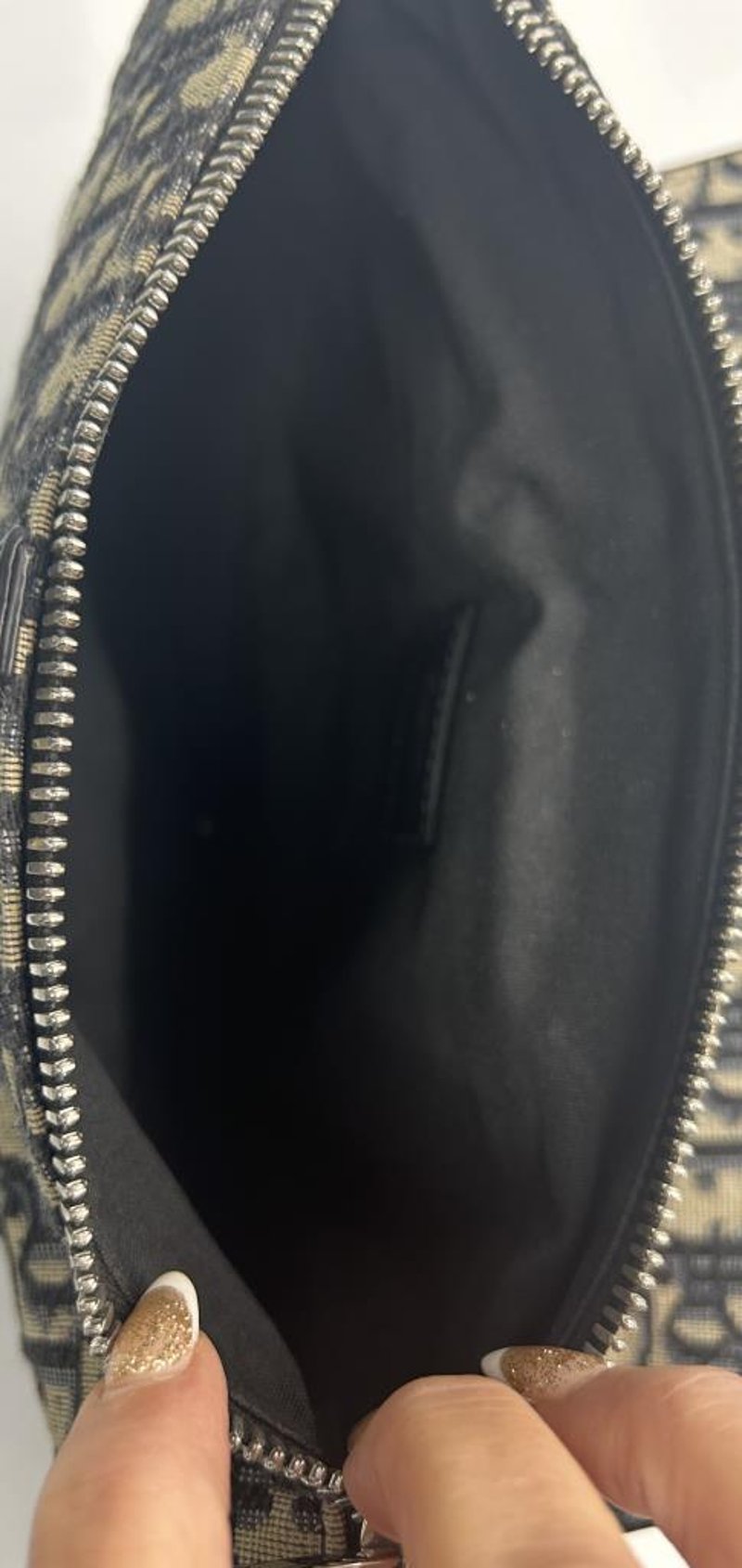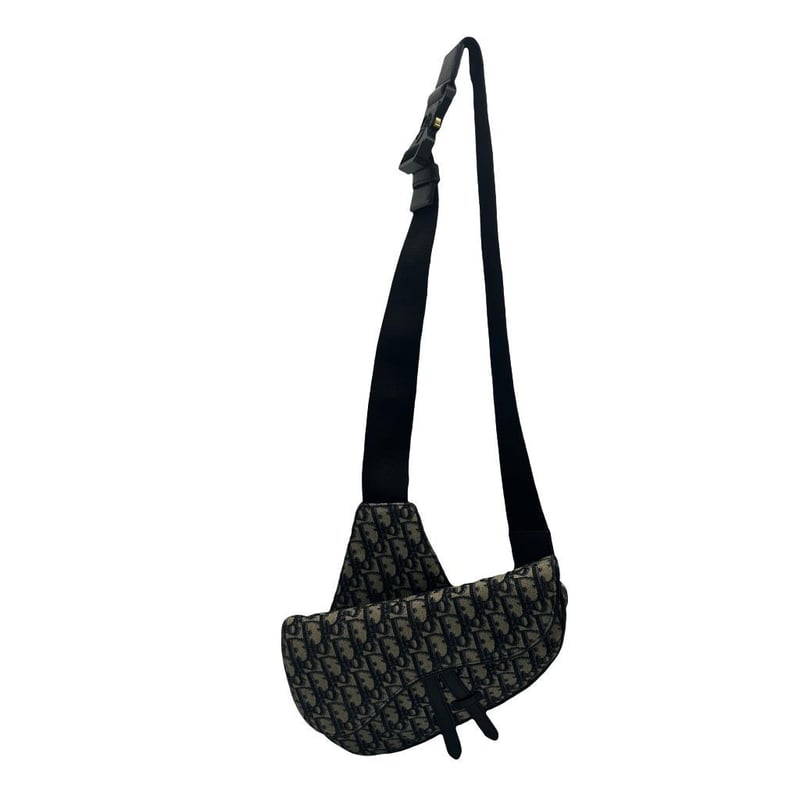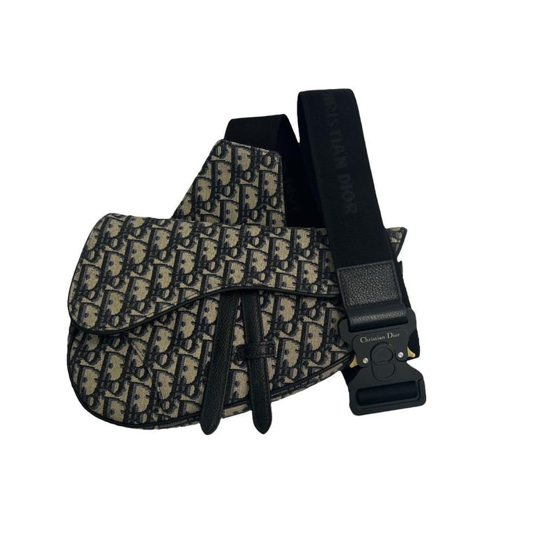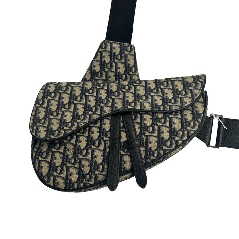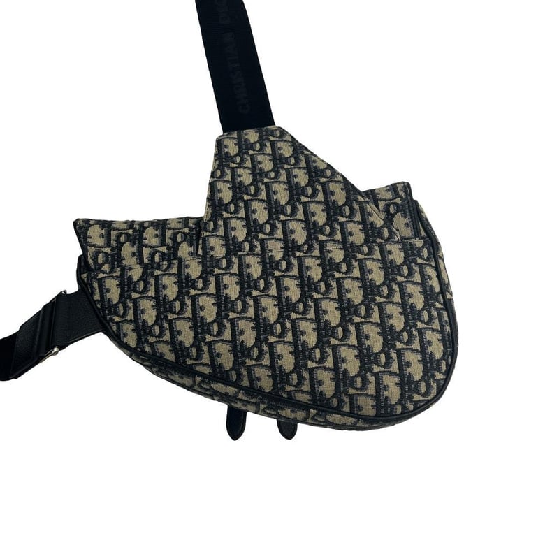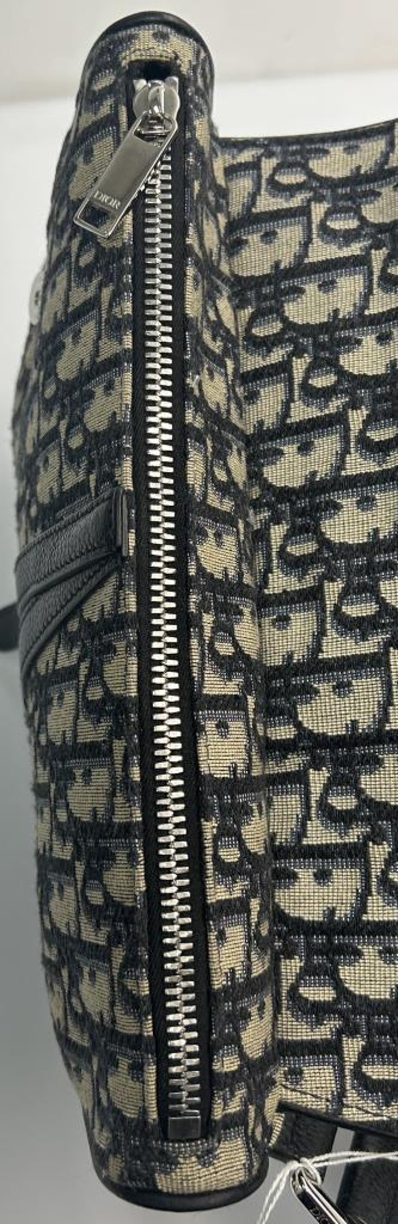 DIOR OBLIQUE JACQUARD MEN'S SADDLE BAG, NAVY, BLACK & BEIGE CANVAS WITH NAVY LEATHER TRIM, FOLD OVER DOME & ZIP CLOSURE, SILVER TONE HARDWARE, ADJUSTABLE BLACK STRAP WITH ALUMINIUM CD SIGNATURE BUCKLE, BLACK COTTON LINING, MADE IN ITALY. THIS ITEM HAS BEEN PROFESSIONALLY VERIFIED AS A GENUINE PRODUCT AND COMES WITH ACCOMPANYING 3RD PARTY CERTIFICATE OF AUTHENTICITY .
