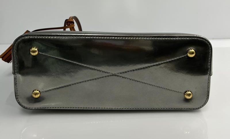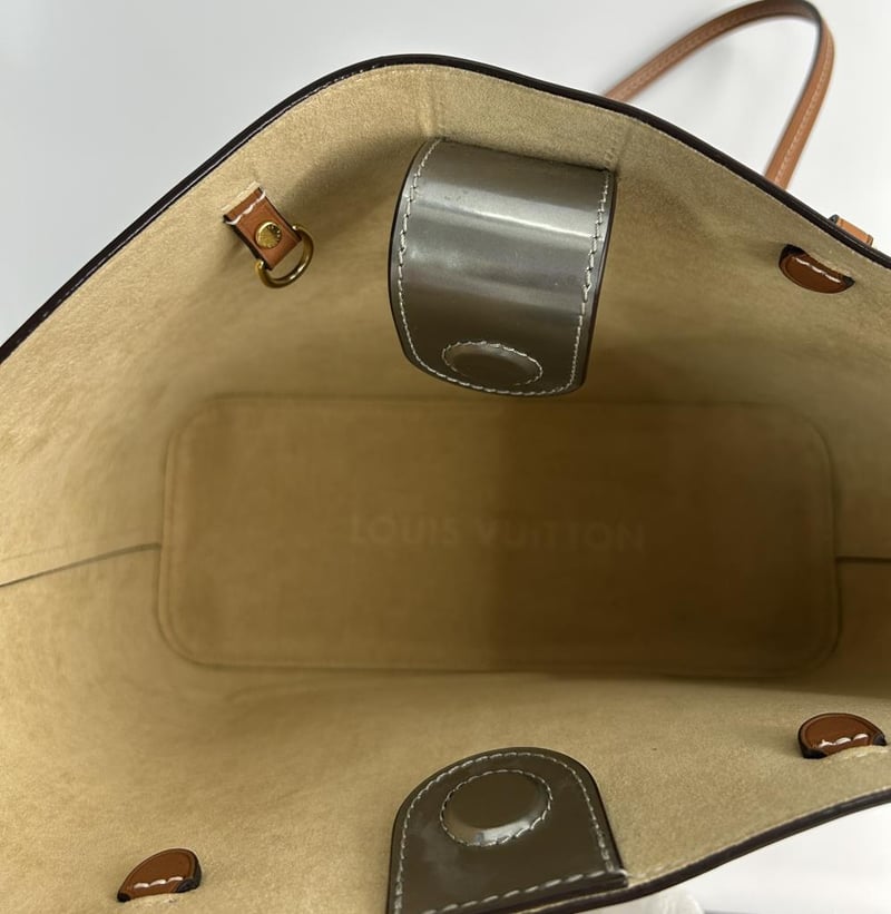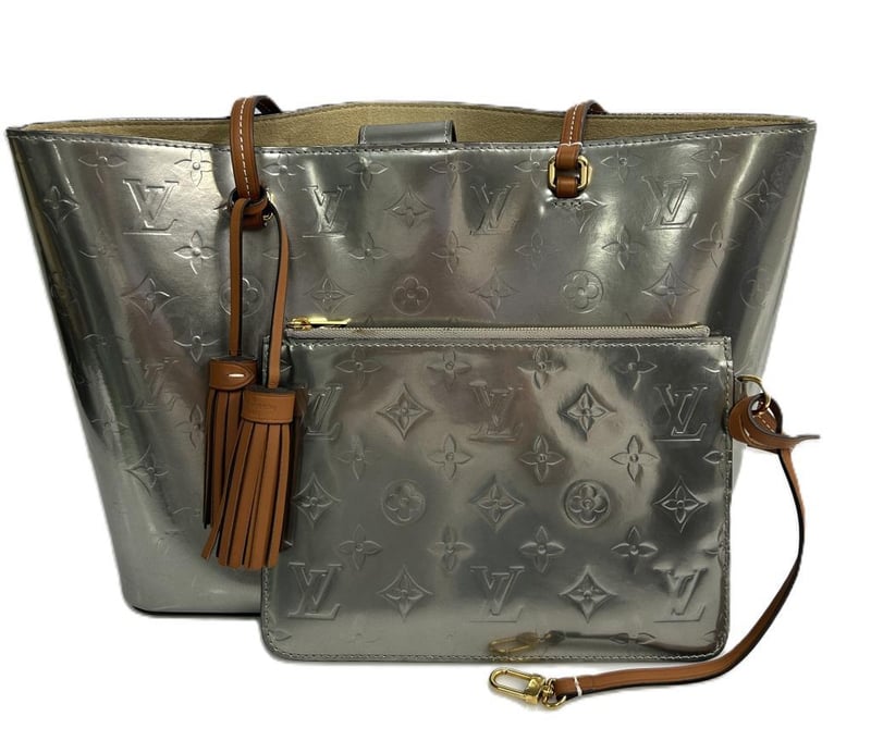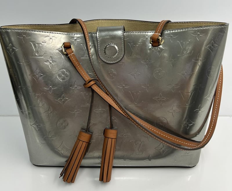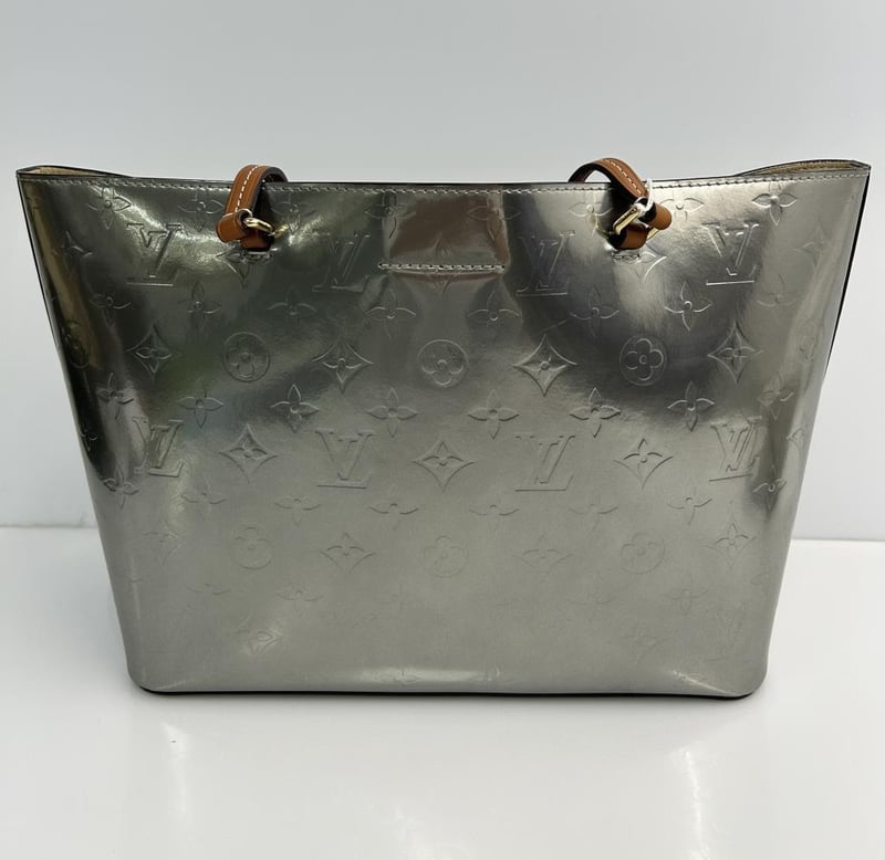 LOUIS VUITTON LONG BEACH PM GRIS METAL TOTE, EMBOSSED METALLIC MONOGRAM VERNIS LEATHER WITH BROWN LEATHER SHOULDER STRAPS & HANGING TASSEL, GOLD-TONE HARDWARE, MAGNETIC CLOSURE, BEIGE SUEDE LINING, REMOVEABLE POUCH WITH ZIP CLOSURE, BAG MEASURES 28 X 23 X 11CM, MADE IN ITALY. THIS ITEM HAS BEEN PROFESSIONALLY VERIFIED AS A GENUINE PRODUCT AND COMES WITH ACCOMPANYING 3RD PARTY CERTIFICATE OF AUTHENTICITY