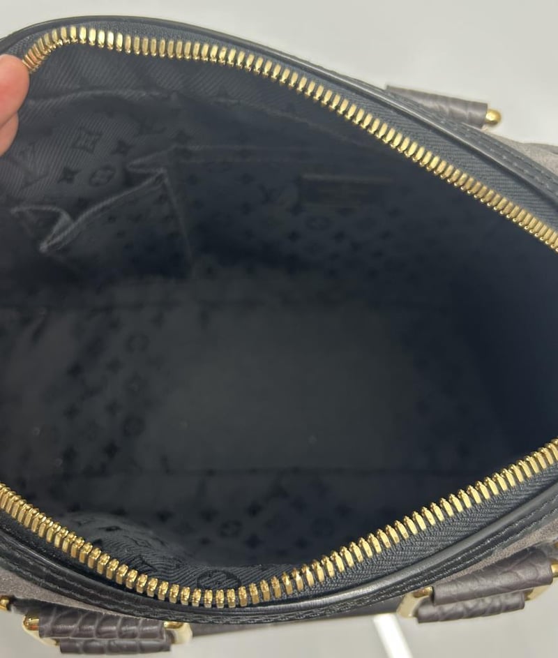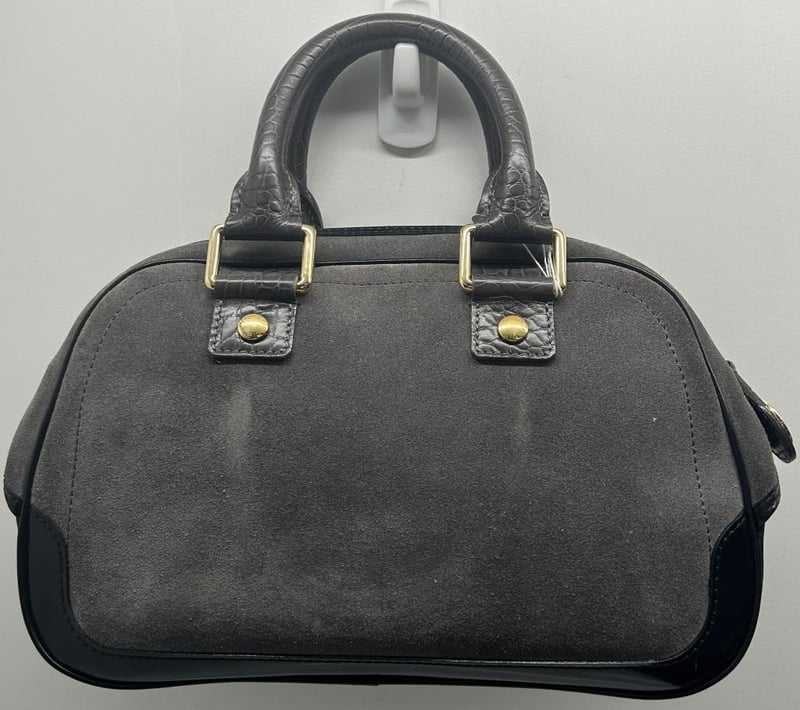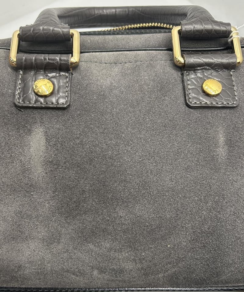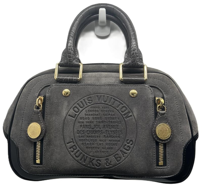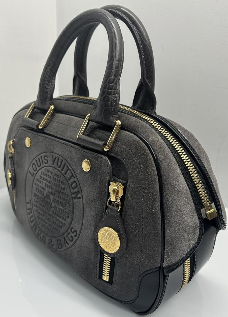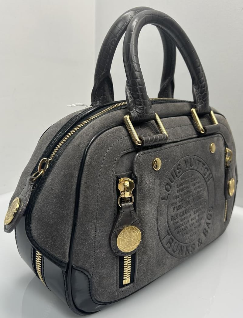 LOUIS VUITTON LIMITED EDITION SUEDE TRUNKS & BAGS BOWLER-STYLE HANDBAG, GOLD-TONE HARDWARE, DUAL ROLLED GREY ALLIGATOR LEATHER HANDLES, EMBOSSED FRONT LOGO PATCH, MONOGRAM FABRIC LINING WITH TWO SLIP POCKETS, CRAFTED IN GREY SUEDE WITH BLACK PATENT LEATHER TRIM, BAG MEASURES 31 X 12.5 X 14.5 CM, MADE IN SPAIN. THIS ITEM HAS BEEN PROFESSIONALLY VERIFIED AS A GENUINE PRODUCT AND COMES WITH ACCOMPANYING 3RD PARTY CERTIFICATE OF AUTHENTICITY.